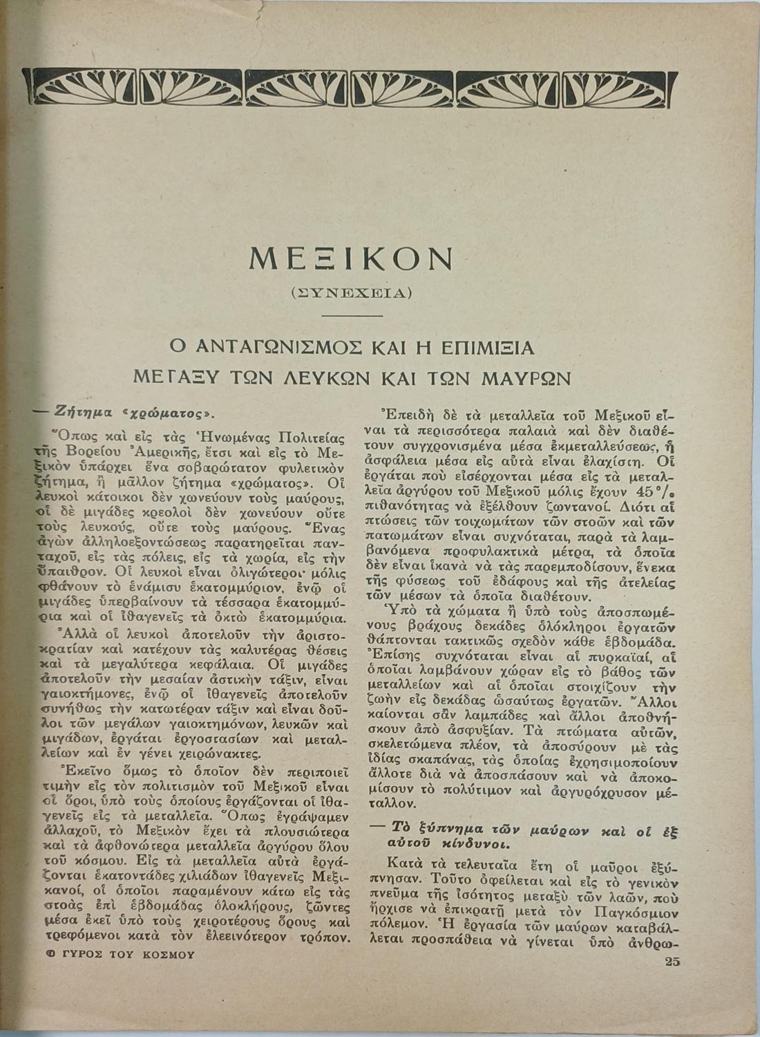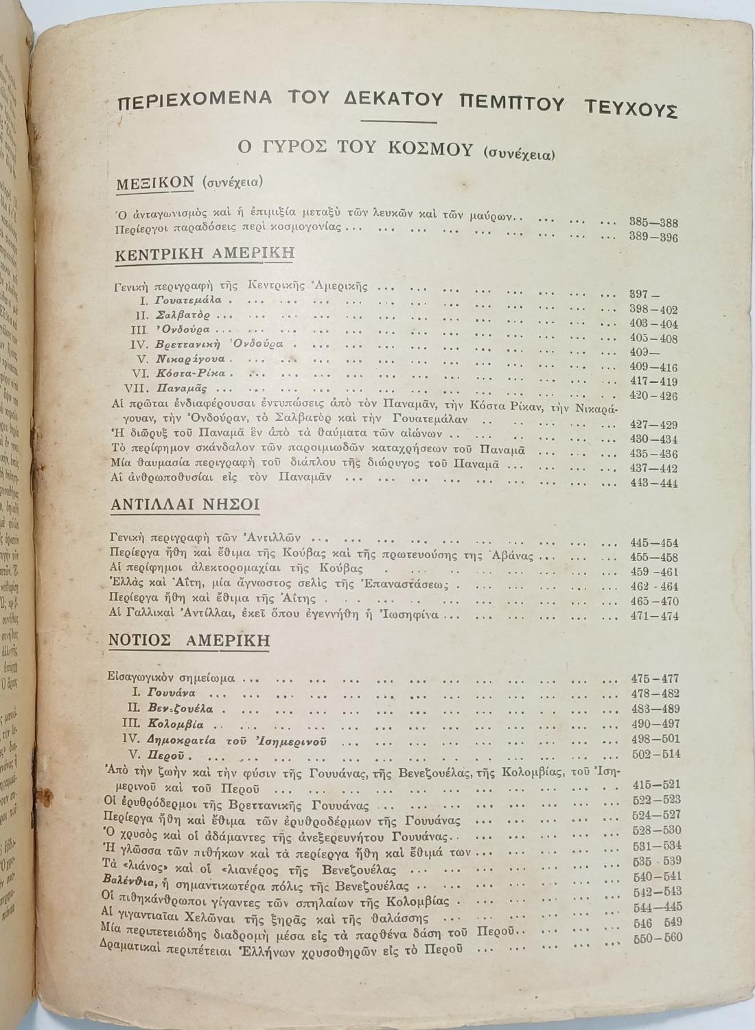 Το σπάνιο τεύχος 15 του περιοδικού “Ο Γύρος του Κόσμου” (Μηνιαία “Ακρόπολις”, Ιούλιος 1935) περιλαμβάνει ταξιδιωτικά και γεωγραφικά θέματα με επίκεντρο την αμερικανική ήπειρο, συνεχίζοντας τη θεματολογία του Μεξικού και καλύπτοντας την Κεντρική Αμερική, τις νήσους Αντίλλες, και τη Νότια Αμερική.