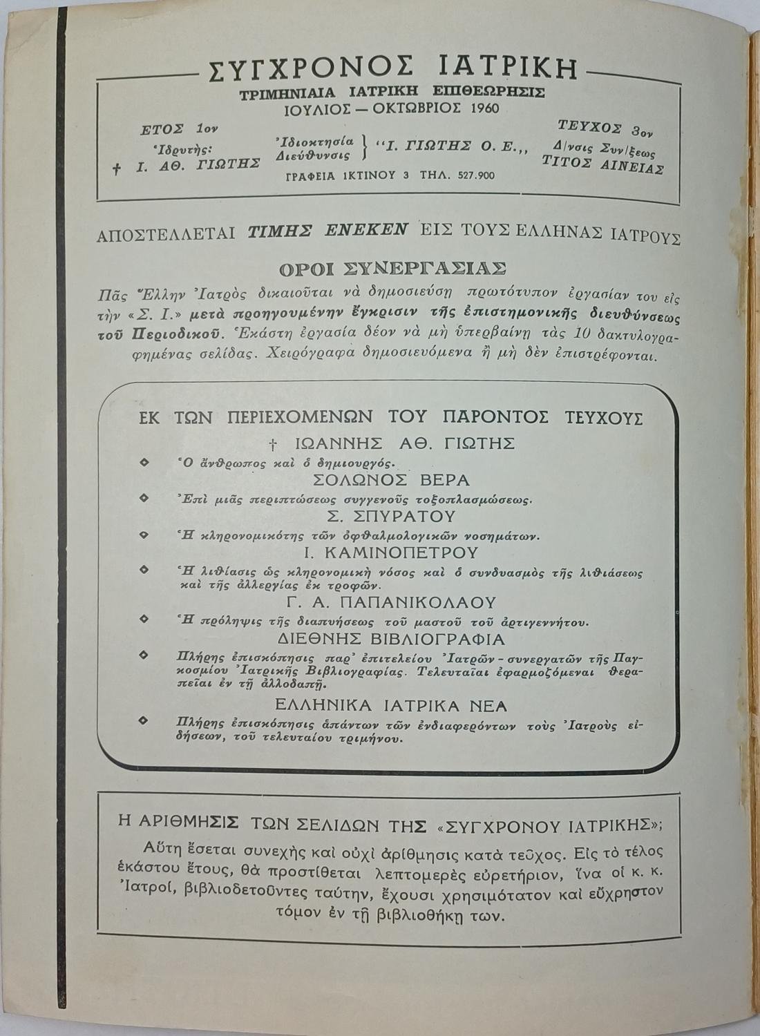 Περιοδικό “Σύγχρονος Ιατρική” Τεύχ. 3ον, Έτος 1ον Ιούλ.-Οκτ. 1960