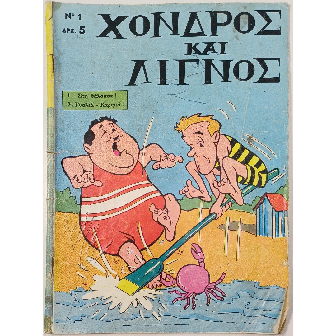 Το σπάνιο τεύχος Νο 1 της ελληνικής σειράς κόμικς “Χονδρός και Λιγνός”, περιέχει δύο κύριες χιουμοριστικές ιστορίες με πρωταγωνιστές τους κλασικούς κωμικούς Σταν Λόρελ (Λιγνός) και Όλιβερ Χάρντι (Χονδρός). Η πρώτη ιστορία, με τίτλο “Στη θάλασσα!”, όπου οι δύο φίλοι έχουν μια περιπέτεια στην παραλία με μια βάρκα και έναν κάβουρα, ενώ η δεύτερη ιστορία φέρει τον τίτλο “Γυαλιά – Καρφιά!”.