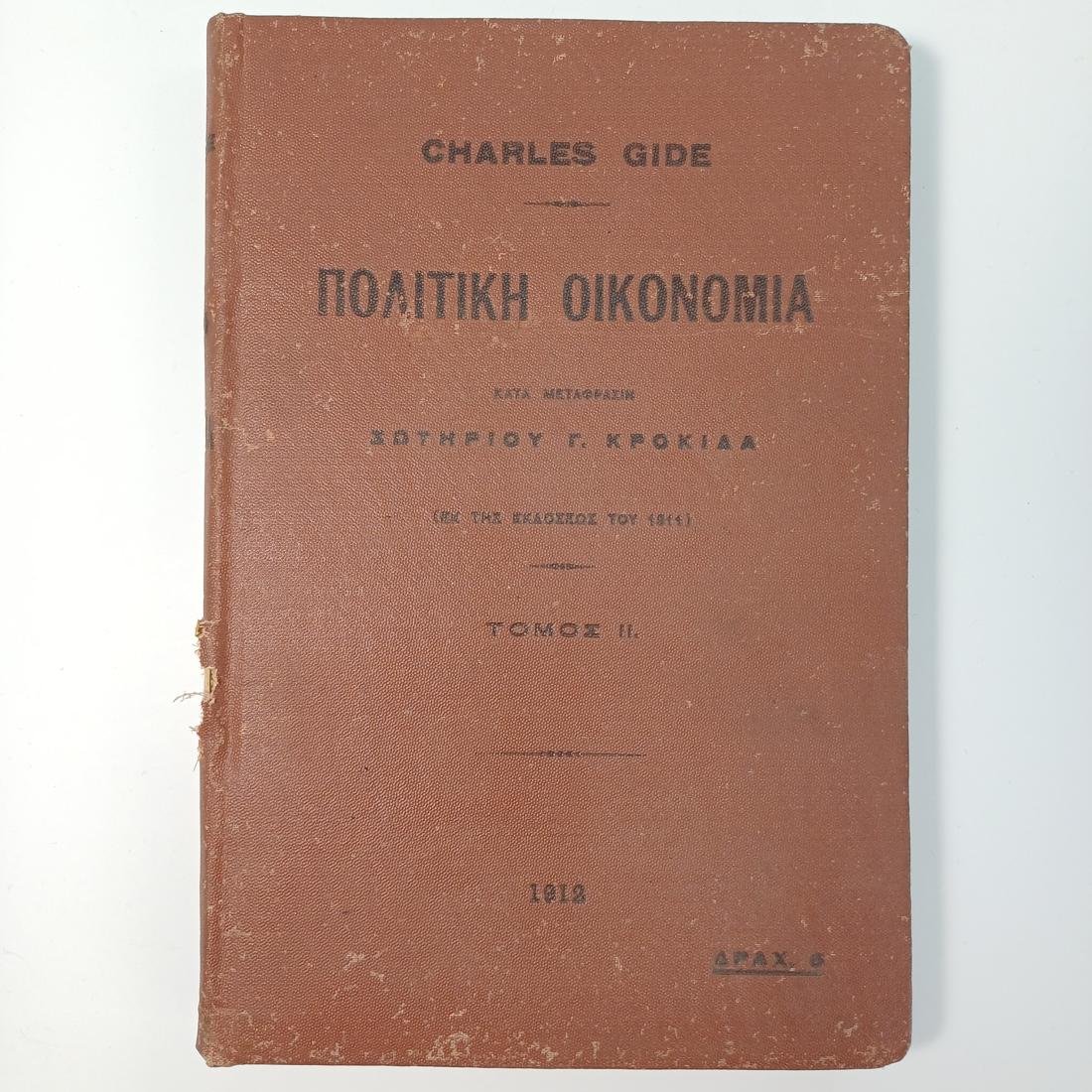 Το σπάνιο βιβλίο “Πολιτική Οικονομία” του Γάλλου οικονομολόγου Charles Gide (Σαρλ Ζιντ), έκδοση του 1912 σε μετάφραση του Σωτηρίου Γ. Κροκιδά, αποτελεί ένα από τα πιο επιδραστικά εγχειρίδια στην ιστορία της οικονομικής σκέψης. Ο συγγραφέας, ο οποίος υπήρξε κορυφαία προσωπικότητα του συνεργατικού κινήματος και της «Σχολής της Νιμ», επιδιώκει στο έργο αυτό να παρουσιάσει τις θεμελιώδεις οικονομικές αρχές με τρόπο απλό και αμερόληπτο, γεφυρώνοντας το χάσμα ανάμεσα στον κλασικό φιλελευθερισμό και τον σοσιαλισμό μέσω της ιδέας της αλληλεγγύης. Το εγχειρίδιο γνώρισε τεράστια διεθνή επιτυχία, μεταφράστηκε σε δεκάδες γλώσσες και χρησιμοποιήθηκε για πολλές δεκαετίες ως βασικό διδακτικό βοήθημα, καθώς ανέλυε ζητήματα παραγωγής, διανομής και κατανάλωσης του πλούτου, δίνοντας έμφαση στην κοινωνική διάσταση της οικονομίας και τον ρόλο των συνεταιρισμών.