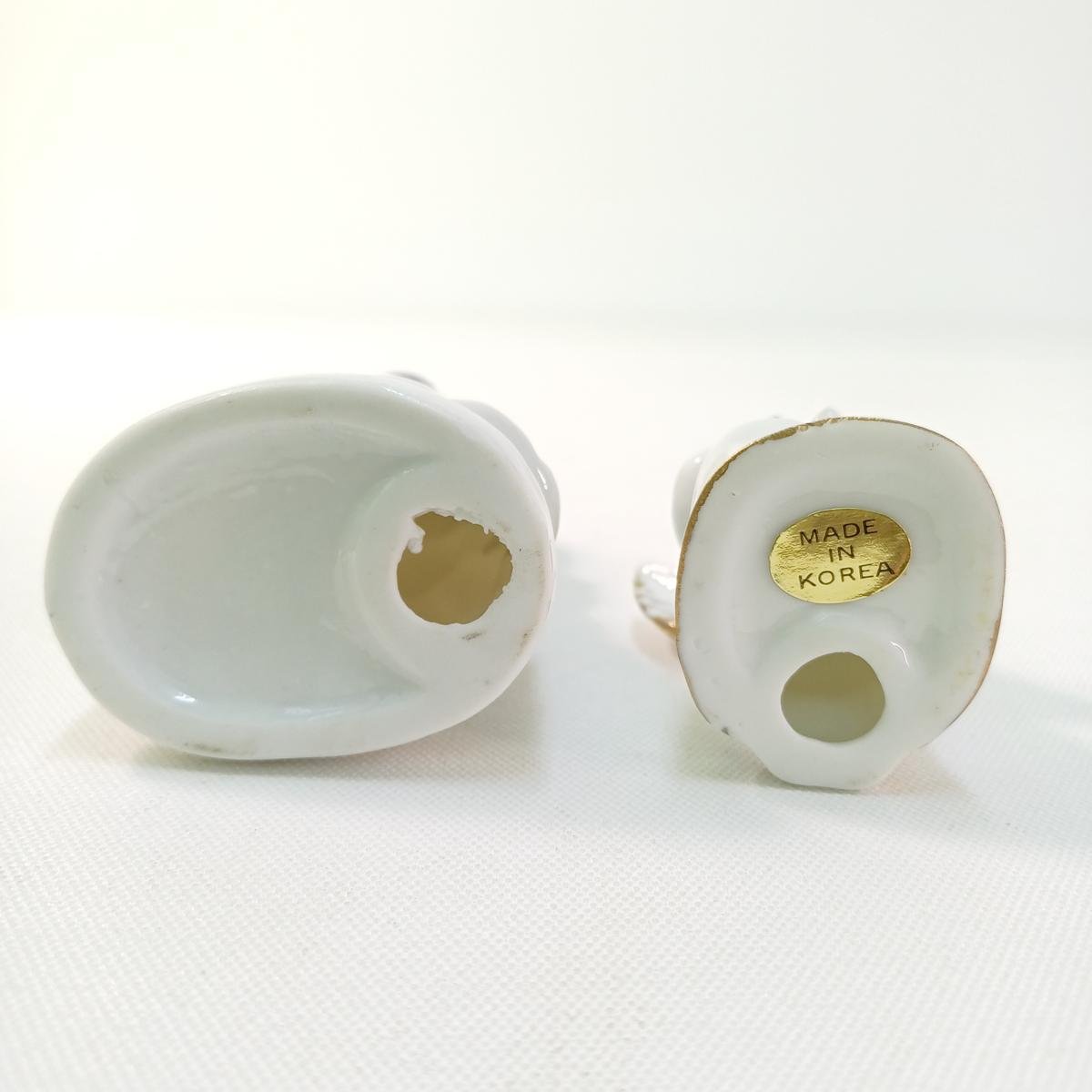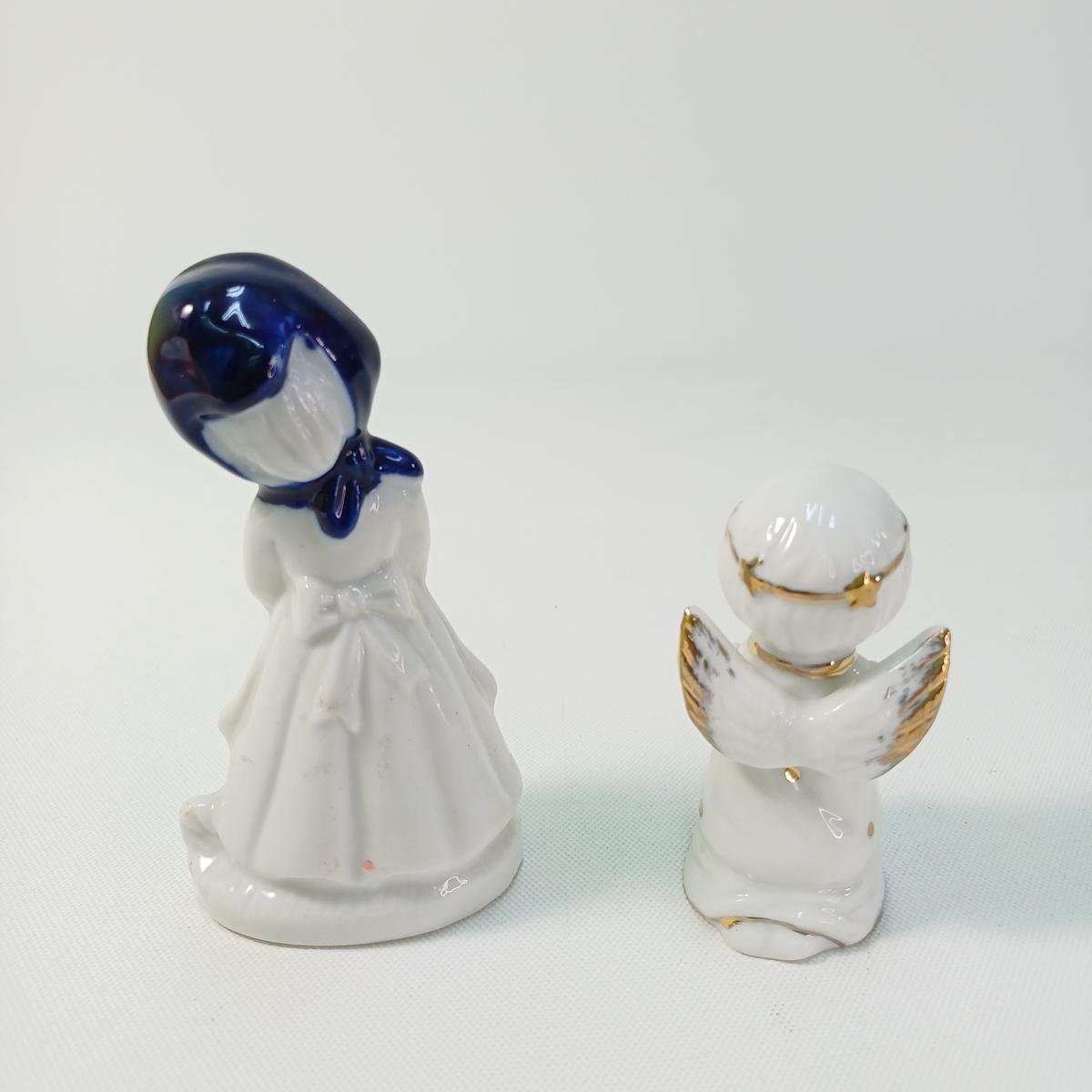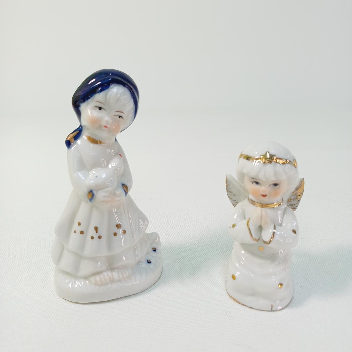 2 vintage πορσελάνινες φιγούρες οι οποίες απεικονίζουν ένα κοριτσάκι να κρατά στην αγκαλιά του μια πάπια και ένα αγγελάκι, αντίστοιχα. Το κοριτσάκι έχει λεπτομέρειες σε χρυσό και μπλε κοβαλτίου, με ύψος 10,5 cm. Το αγγελάκι έχει χρυσές λεπτομέρειες και στο κάτω μέρος φέρει αυτοκόλλητο “Made in Korea”. Το ύψος του είναι 7,5 cm.