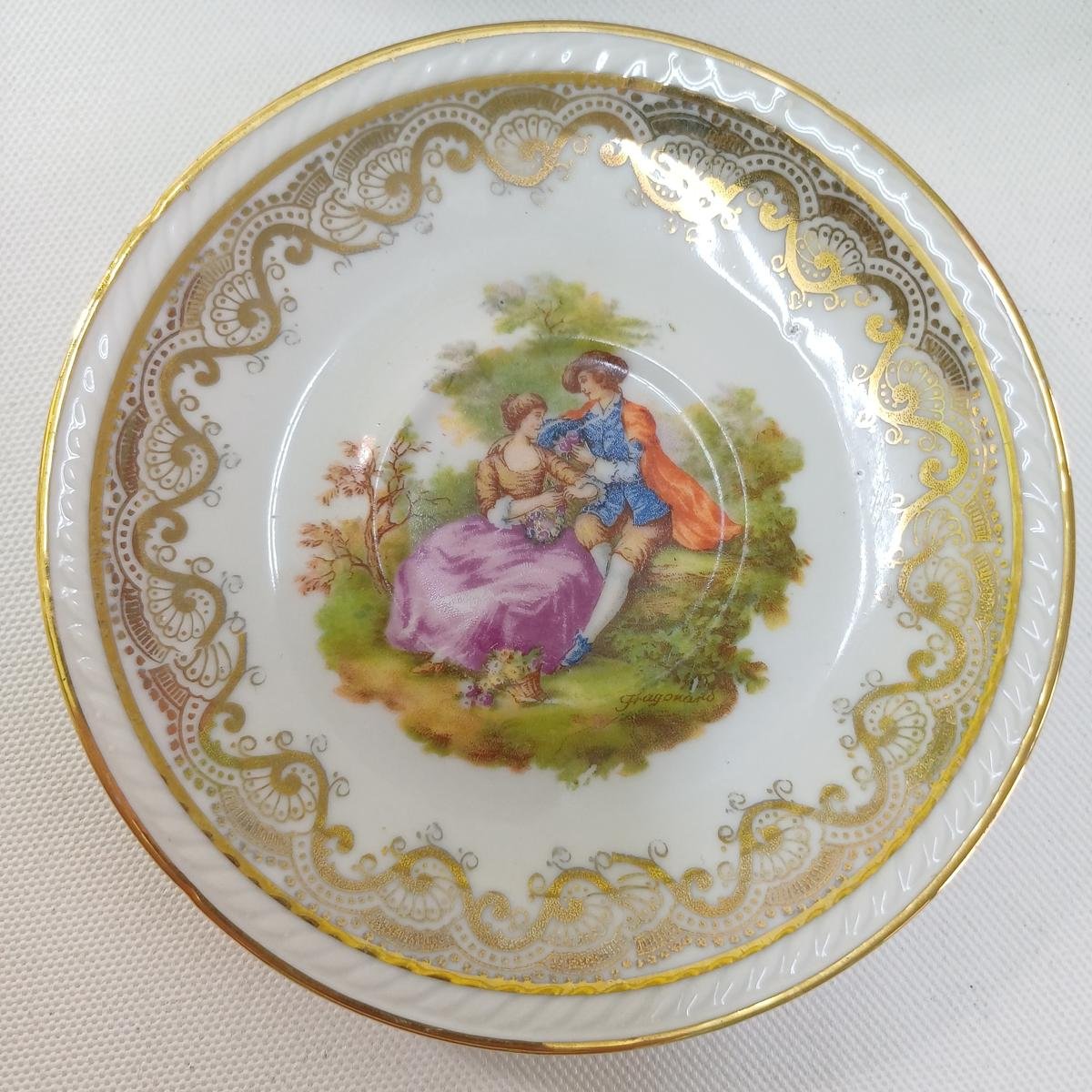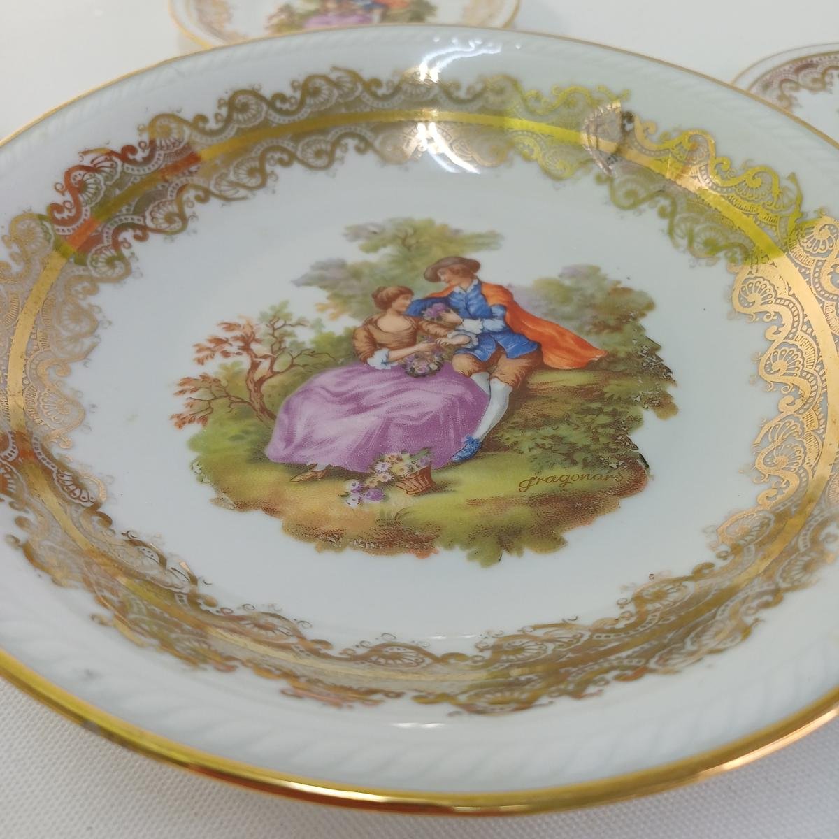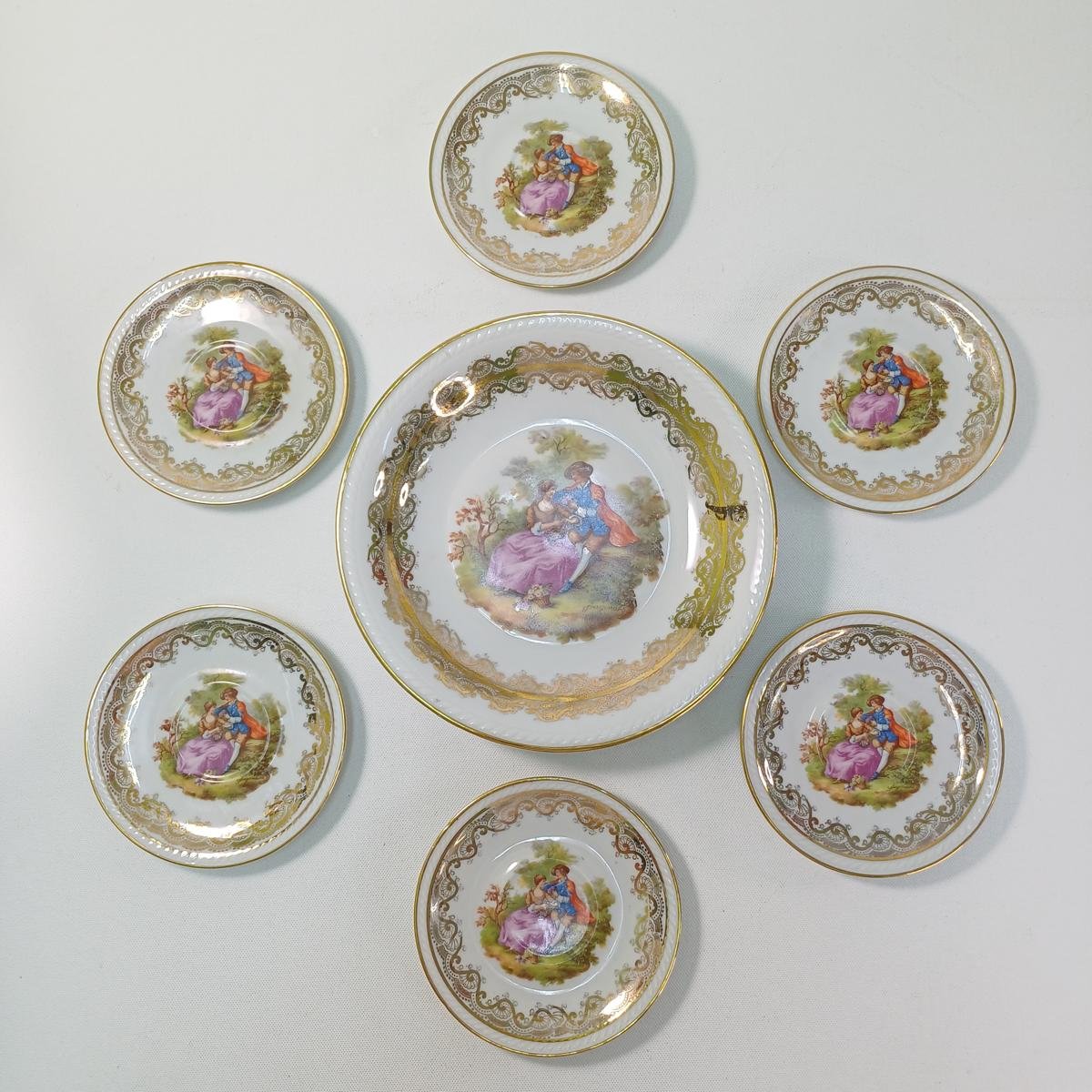 Πορσελάνινο σετ 7 πιάτων Winterling Bavaria Germany τα οποία απεικονίζουν μια κλασική σκηνή εμπνευσμένη από τον ζωγράφο Fragonard και χρονολογούνται στα μέσα του 20ού αιώνα. To set αποτελείται από 1 πιάτο διαμέτρου 20 cm και 6 μικρά πιατάκια διαμέτρου 11,5 cm. Τα χρώματα της ρομαντικής σκηνής έχουν παραμείνει ζωηρά καθώς και η χρυσή διακόσμηση περιμετρικά της σκηνής.