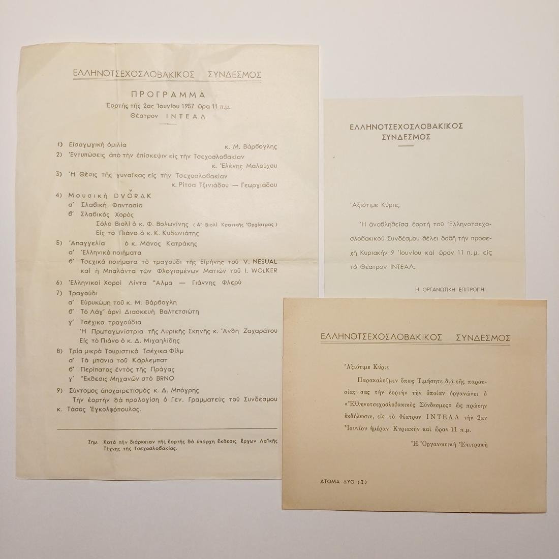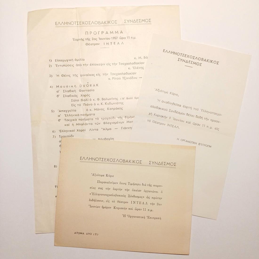 Πρόγραμμα και πρόσκληση για την εορταστική εκδήλωση του Ελληνοτσεχοσλοβακικού Συνδέσμου, 9-6-1957 (LOT 3 τεμαχίων)