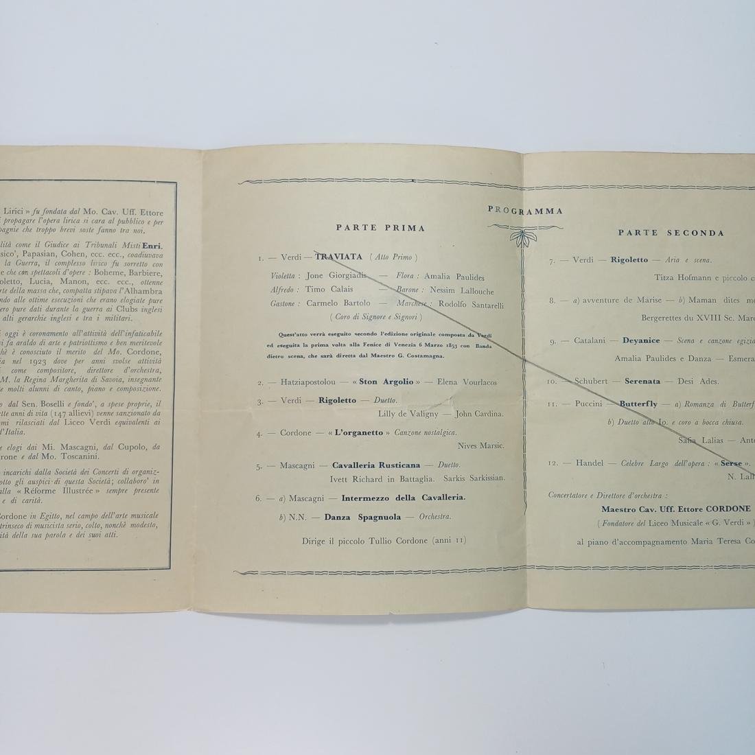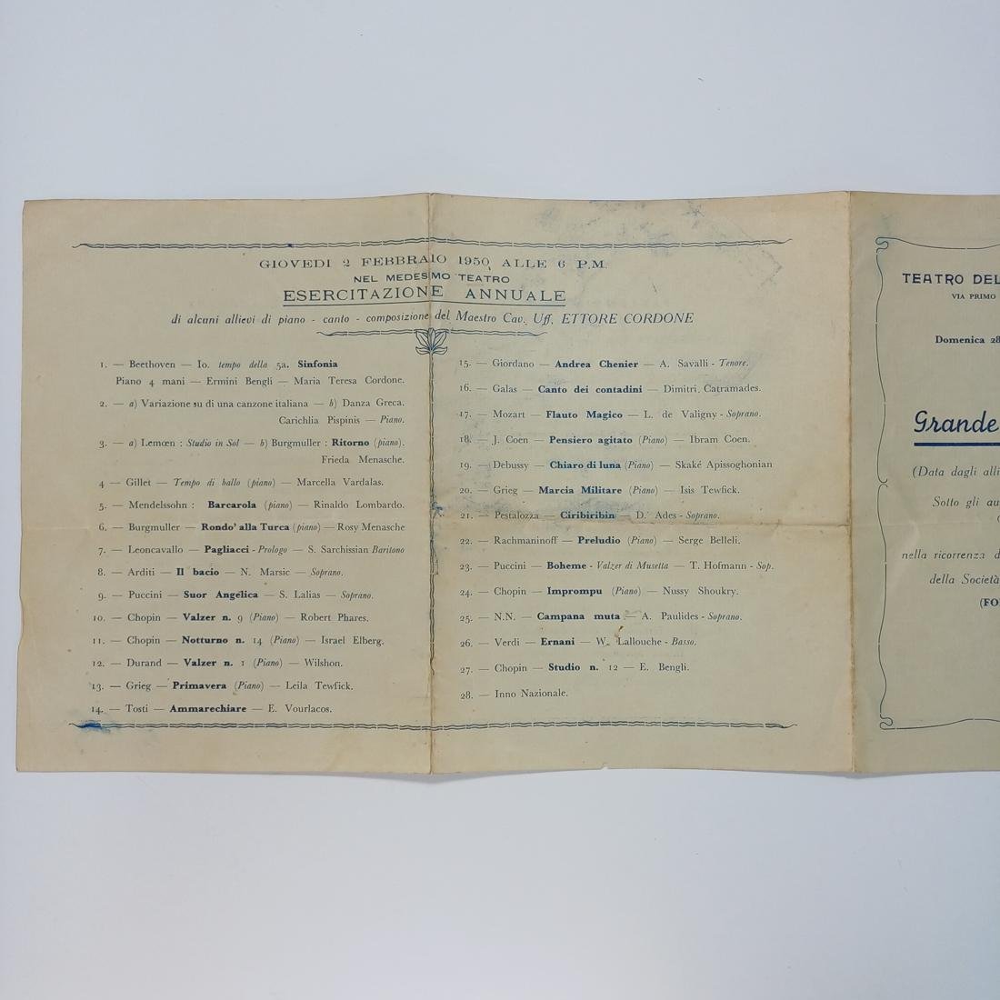 Πρόγραμμα της καλλιτεχνικής εκδήλωσης “Μεγάλο Γκαλά Όπερας” (Grande Gala d’Opera), το οποίο πραγματοποιήθηκε την Κυριακή 28 Ιανουαρίου 1950, στο Θέατρο του Ινστιτούτου Don Bosco στην Αλεξάνδρεια της Αιγύπτου. Η εκδήλωση διοργανώθηκε από τους μαθητές του Μαέστρου E. Cordone για τον εορτασμό της 15ης επετείου της Διεθνούς Εταιρείας Λυρικών Θεαμάτων (Fondazione Cordone), αναδεικνύοντας την έντονη καλλιτεχνική δραστηριότητα της ιταλικής παροικίας στην πόλη εκείνη την εποχή. Το γκαλά τελούσε υπό την αιγίδα του G. A. Spechel, τότε Γενικού Προξένου της Ιταλίας στην Αλεξάνδρεια, γεγονός που υπογραμμίζει την επίσημη και πολιτιστική σημασία της βραδιάς για την τοπική ευρωπαϊκή κοινότητα. Το Ινστιτούτο Don Bosco, όπου φιλοξενήθηκε η παράσταση, παραμένει έως σήμερα ένας ιστορικός εκπαιδευτικός και πολιτιστικός θεσμός στην Αλεξάνδρεια, συνδέοντας την ιταλική παιδεία με την τέχνη και την τοπική κοινωνία.