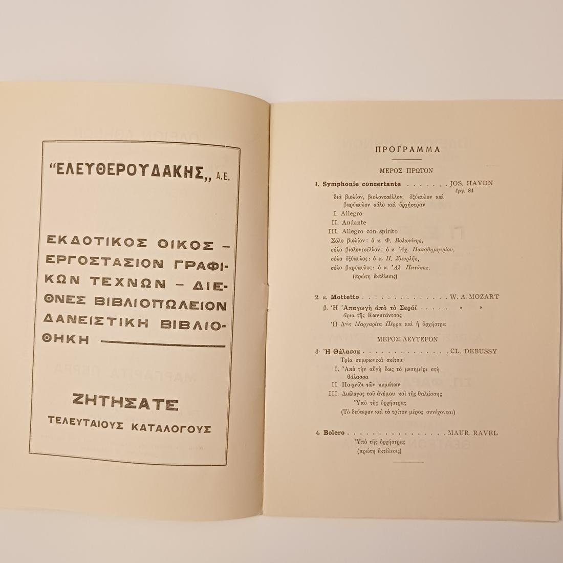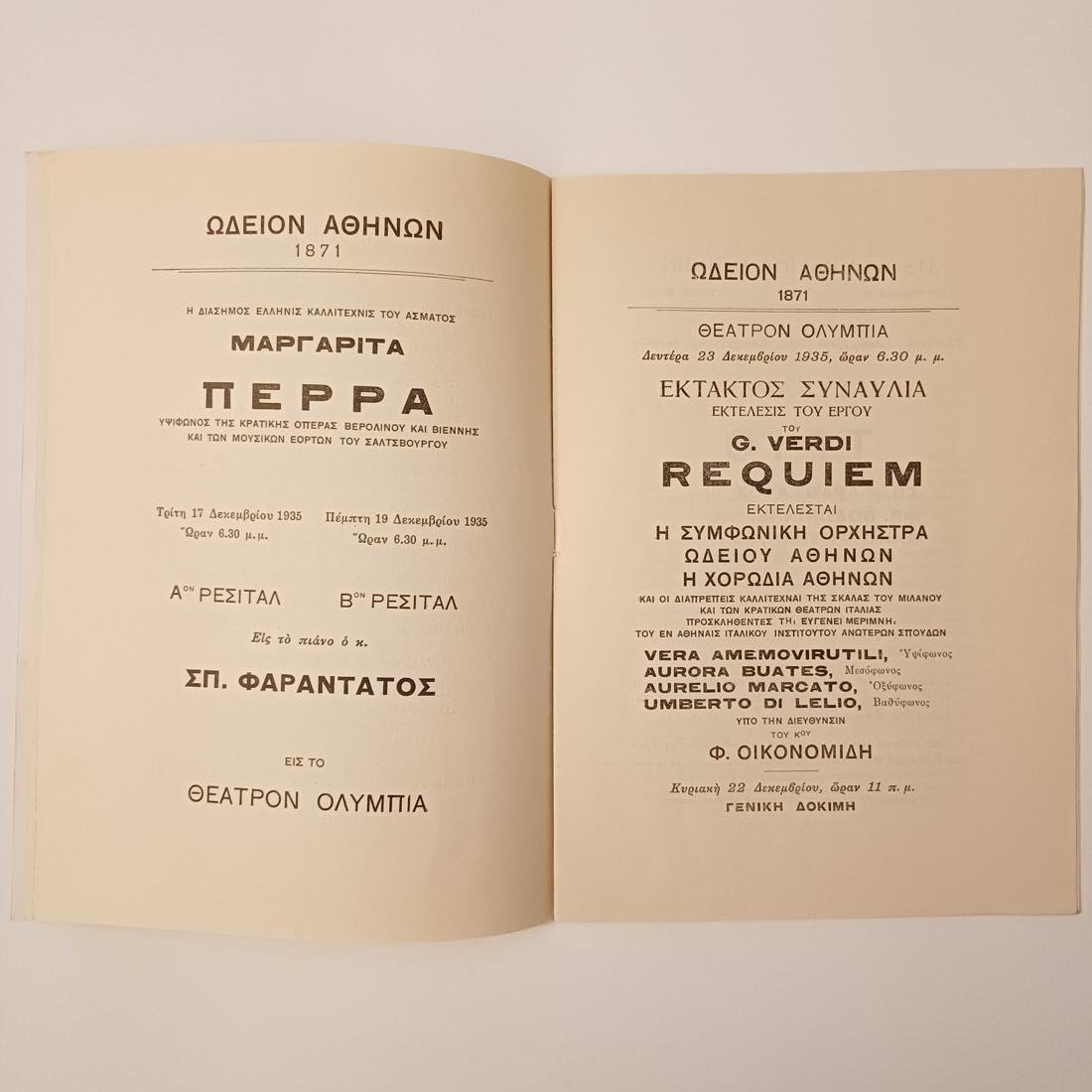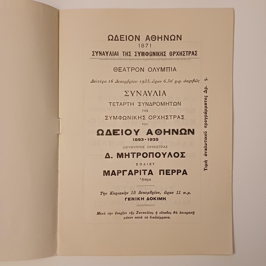 Πρόγραμμα που αφορά την ιστορική Τέταρτη Συναυλία Συνδρομητών της Συμφωνικής Ορχήστρας του Ωδείου Αθηνών, η οποία πραγματοποιήθηκε τη Δευτέρα 16 Δεκεμβρίου 1935 στο Θέατρο Ολύμπια, υπό τη διεύθυνση του κορυφαίου Δημήτρη Μητρόπουλου και με σολίστ τη διακεκριμένη υψίφωνο Μαργαρίτα Πέρρα
