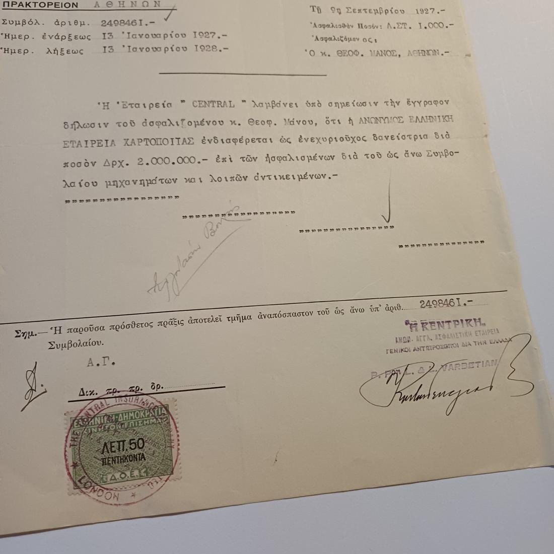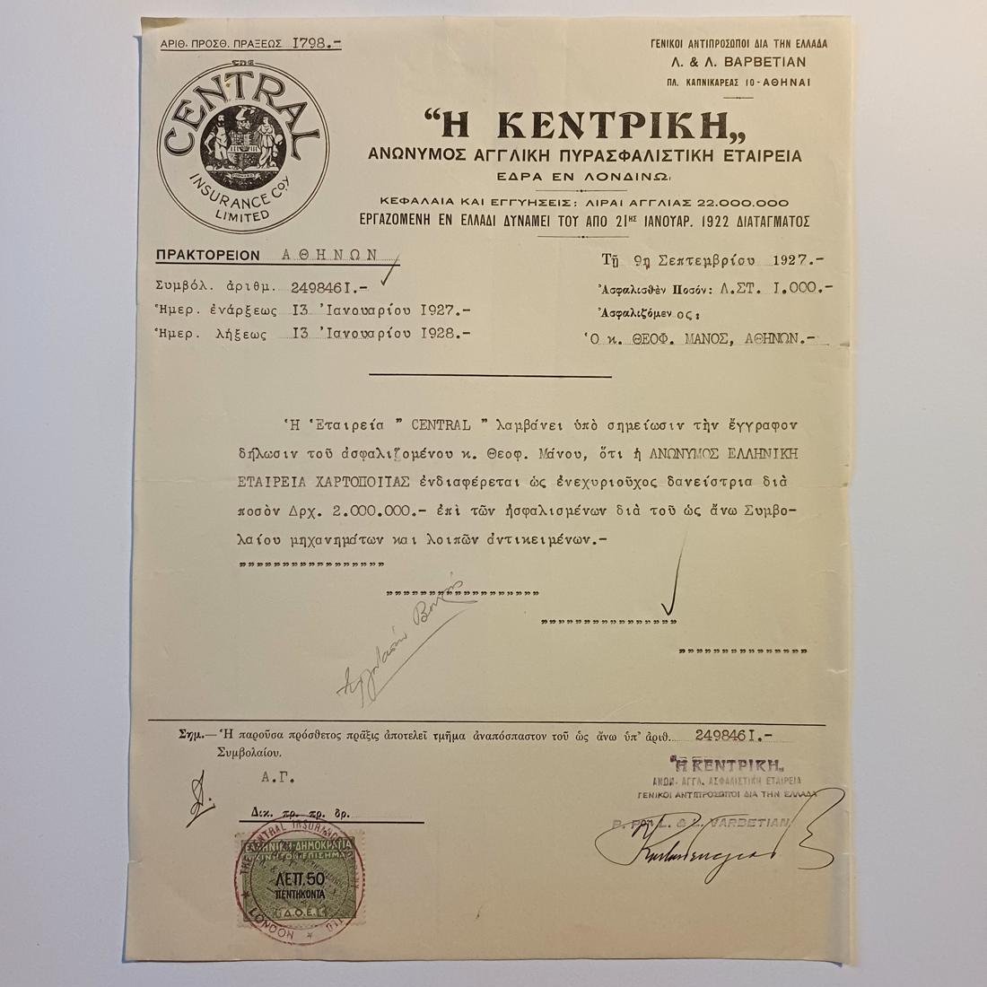 Πρόσθετη πράξη σε ασφαλιστήριο συμβόλαιο της πυρασφαλιστικής αγγλικής εταιρείας “Η ΚΕΝΤΡΙΚΗ” (Central Insurance Co. Limited), η οποία εκδόθηκε στην Αθήνα στις 9 Σεπτεμβρίου 1927 περιόδου Μεσοπολέμου. Η εταιρεία είχε την έδρα της στο Λονδίνο, αλλά λειτουργούσε στην Ελλάδα βάσει διατάγματος του 1922, με γενικούς αντιπροσώπους τους Λ. & Α. Βαρβετιάν που διατηρούσαν γραφεία στην πλατεία Καπνικαρέας. Αφορά έναν ασφαλισμένο πελάτη και ορίζει την “Ανώνυμο Ελληνική Εταιρεία Χαρτοποιίας” ως ενεχυρούχο δανείστρια για το σημαντικό για την εποχή ποσό των 2.000.000 δραχμών, καλύπτοντας μηχανήματα και λοιπά αντικείμενα.