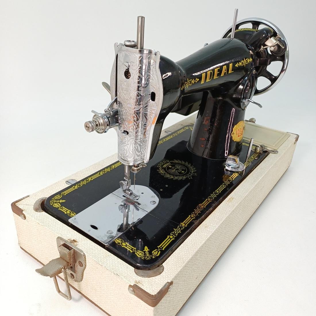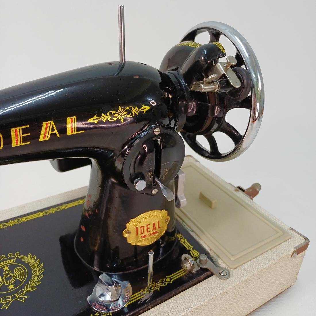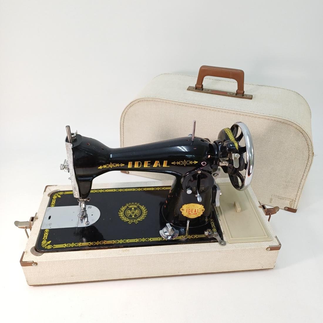 Vintage φορητή, μηχανική ραπτομηχανή μάρκας IDEAL Deluxe κατασκευασμένη στα μέσα του 20ού αιώνα. Το σώμα της είναι μεταλλικό, βαμμένο σε μαύρο χρώμα με χρυσές διακοσμήσεις και λογότυπα. Συνοδεύεται από βαλίτσα μεταφοράς με υφασμάτινη επένδυση και πλαστική λαβή. Διαθέτει χειροκίνητο τροχό (χειροστρόφαλο), κατάλληλη για βασικές ραφές σε υφάσματα, ιδανική για οικιακή χρήση. Συνοδεύεται από το εγχειρίδιό της και διάφορα αξεσουάρ.