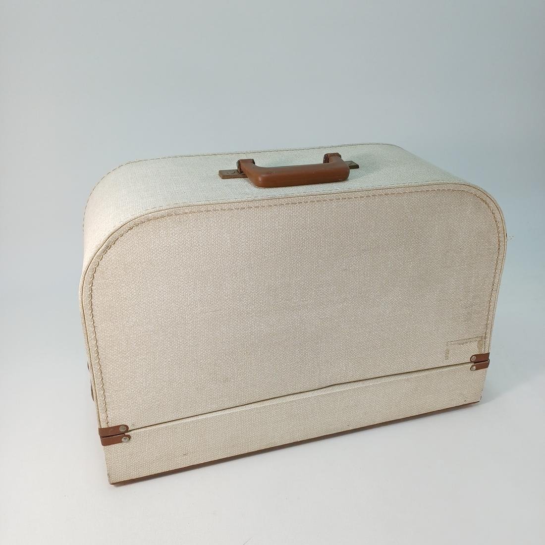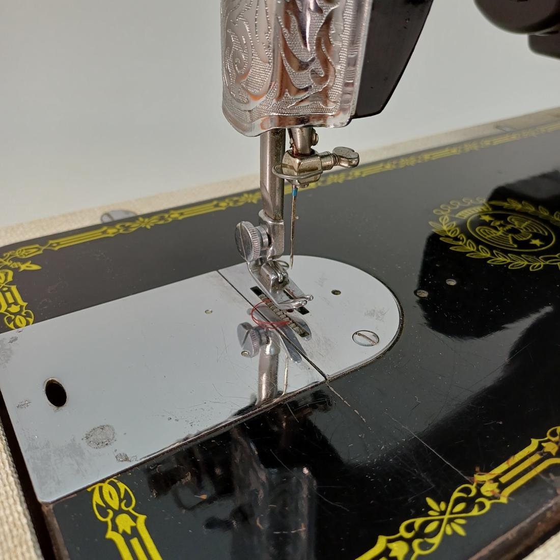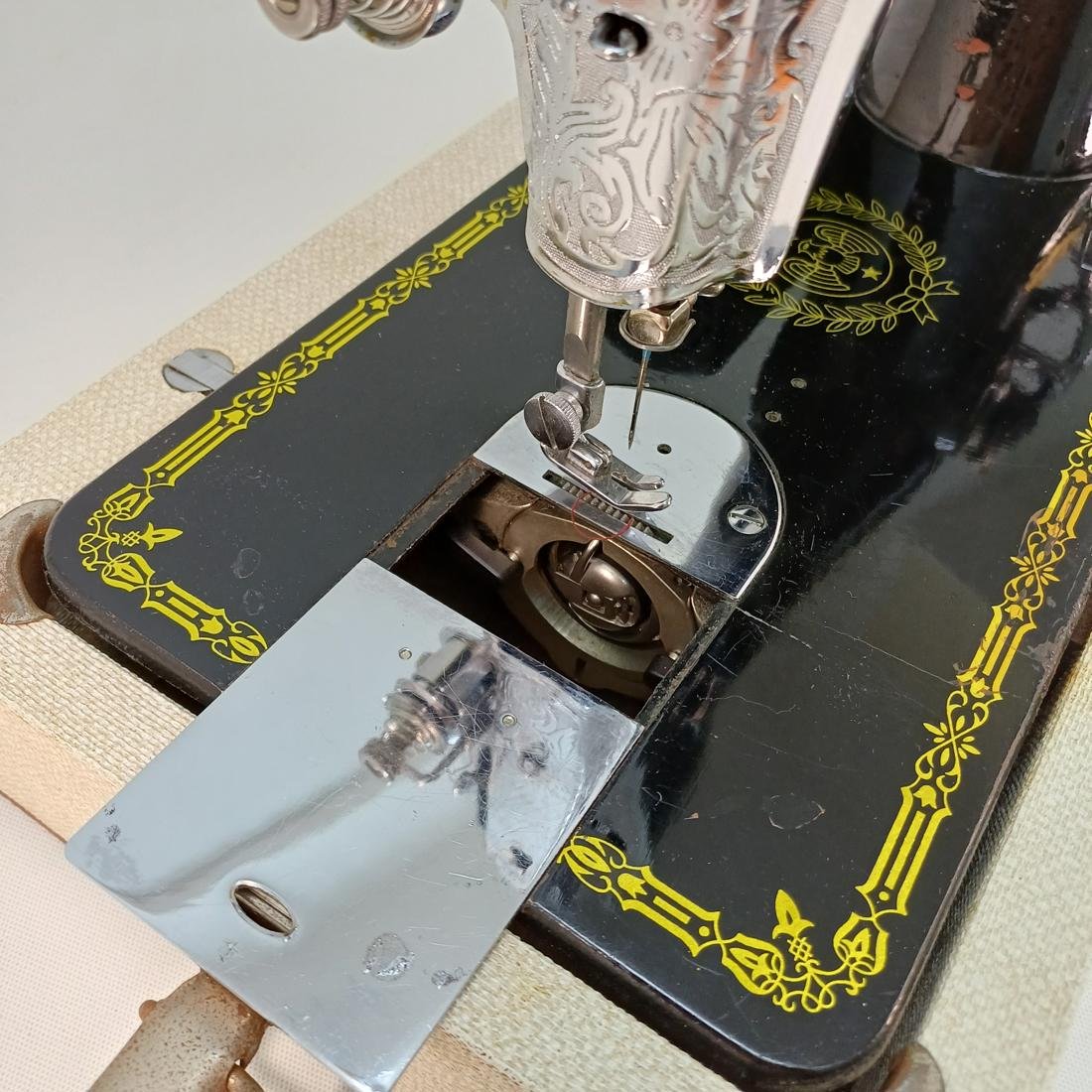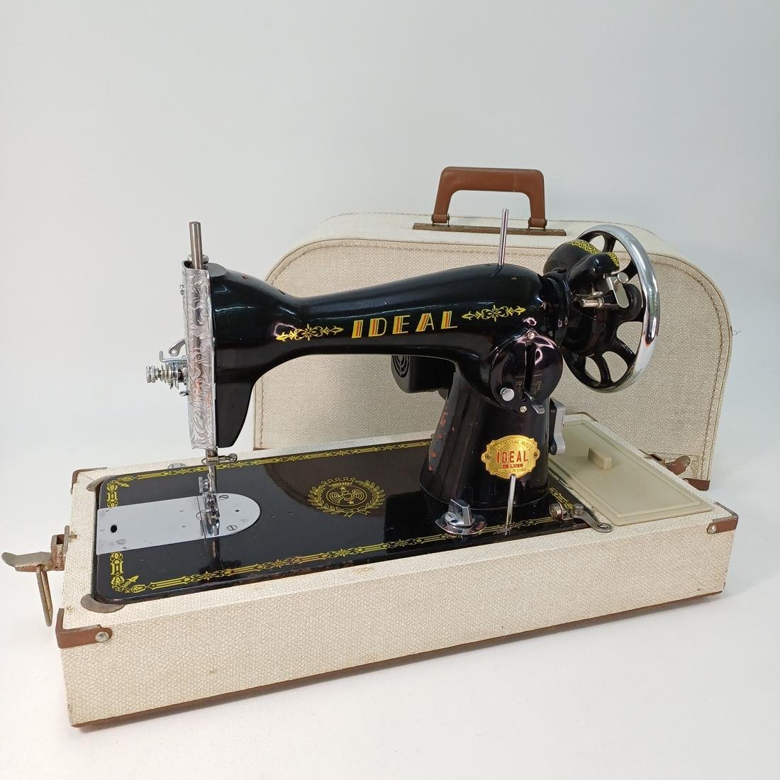 Vintage φορητή, μηχανική ραπτομηχανή μάρκας IDEAL Deluxe κατασκευασμένη στα μέσα του 20ού αιώνα. Το σώμα της είναι μεταλλικό, βαμμένο σε μαύρο χρώμα με χρυσές διακοσμήσεις και λογότυπα. Συνοδεύεται από βαλίτσα μεταφοράς με υφασμάτινη επένδυση και πλαστική λαβή. Διαθέτει χειροκίνητο τροχό (χειροστρόφαλο), κατάλληλη για βασικές ραφές σε υφάσματα, ιδανική για οικιακή χρήση. Συνοδεύεται από το εγχειρίδιό της και διάφορα αξεσουάρ.