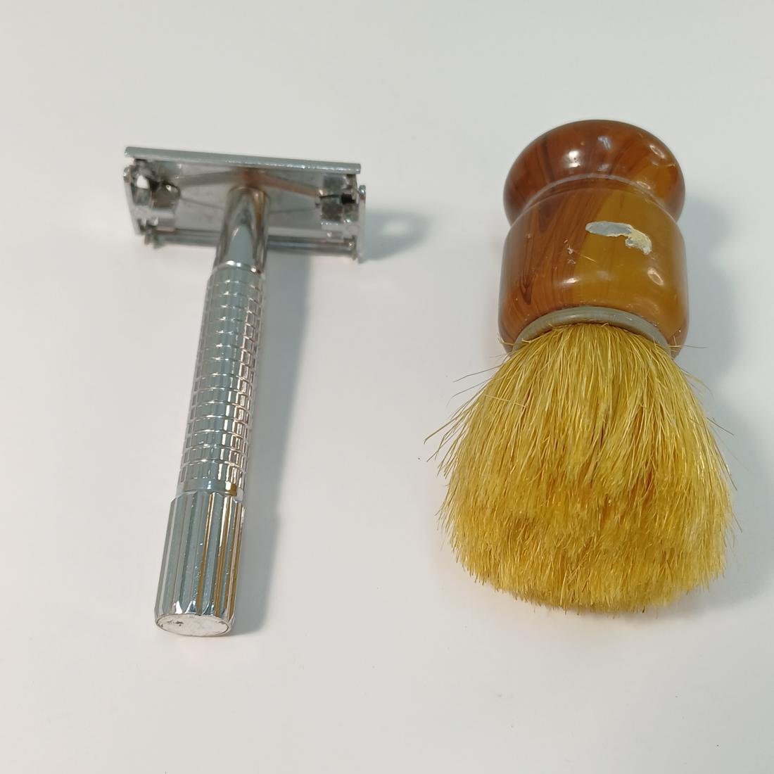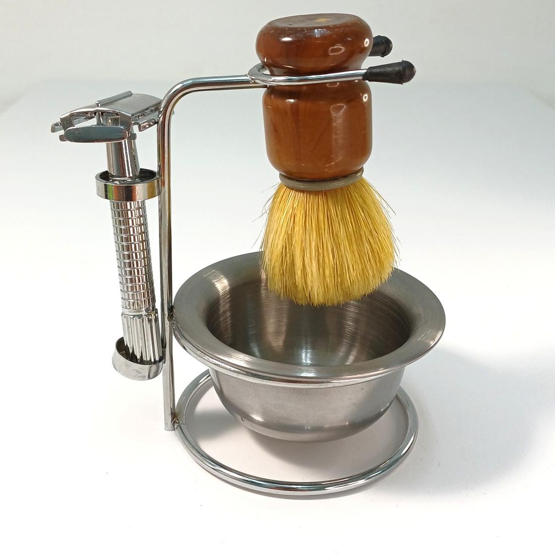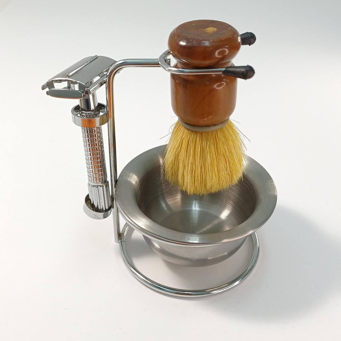 Vintage σετ ξυρίσματος σε μεταλλική βάση. Αποτελείται από ένα ξυράφι ασφαλείας (διπλής λεπίδας), ένα πινέλο ξυρίσματος (με συνθετικές τρίχες) και ένα μεταλλικό μπολ (για να ανάμειξη της κρέμας ξυρίσματος).