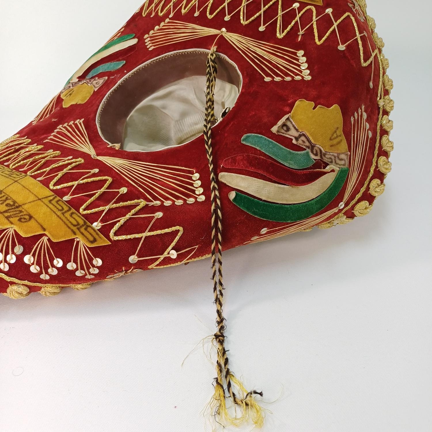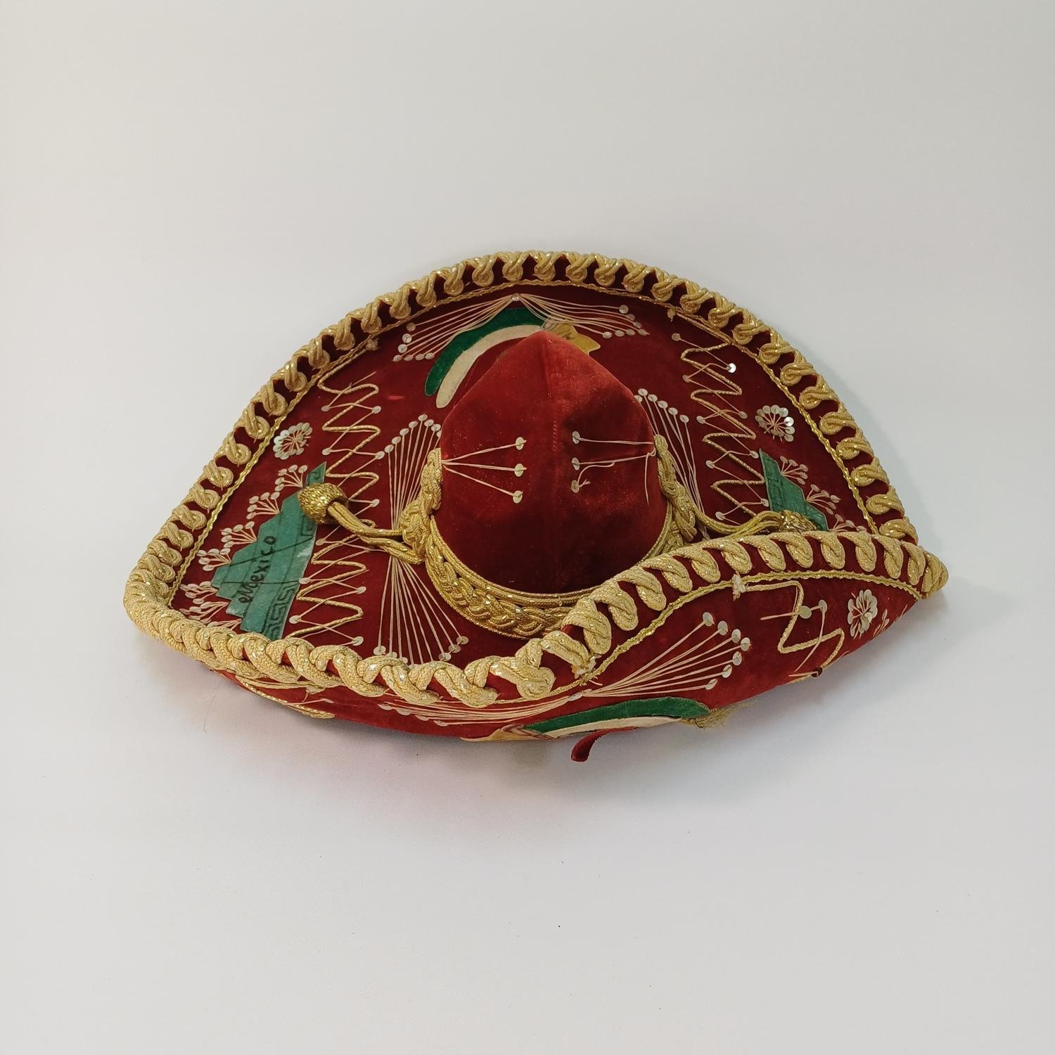 Σομπρέρο της εταιρείας Pigalle διαμέτρου περίπου 60 cm. Έχει έντονα χρώματα (κόκκινο-χρυσό) και βελούδινα υφάσματα. Υπάρχουν φθορές σε κάποια σημεία των υφασμάτων (και των κλωστών) λόγω χρήσης.