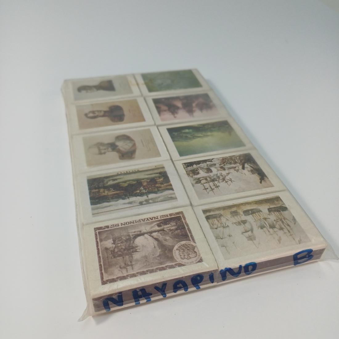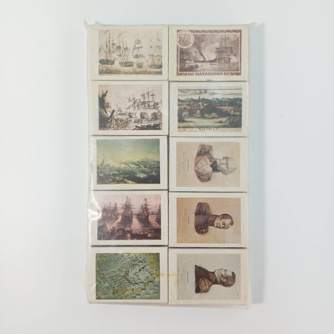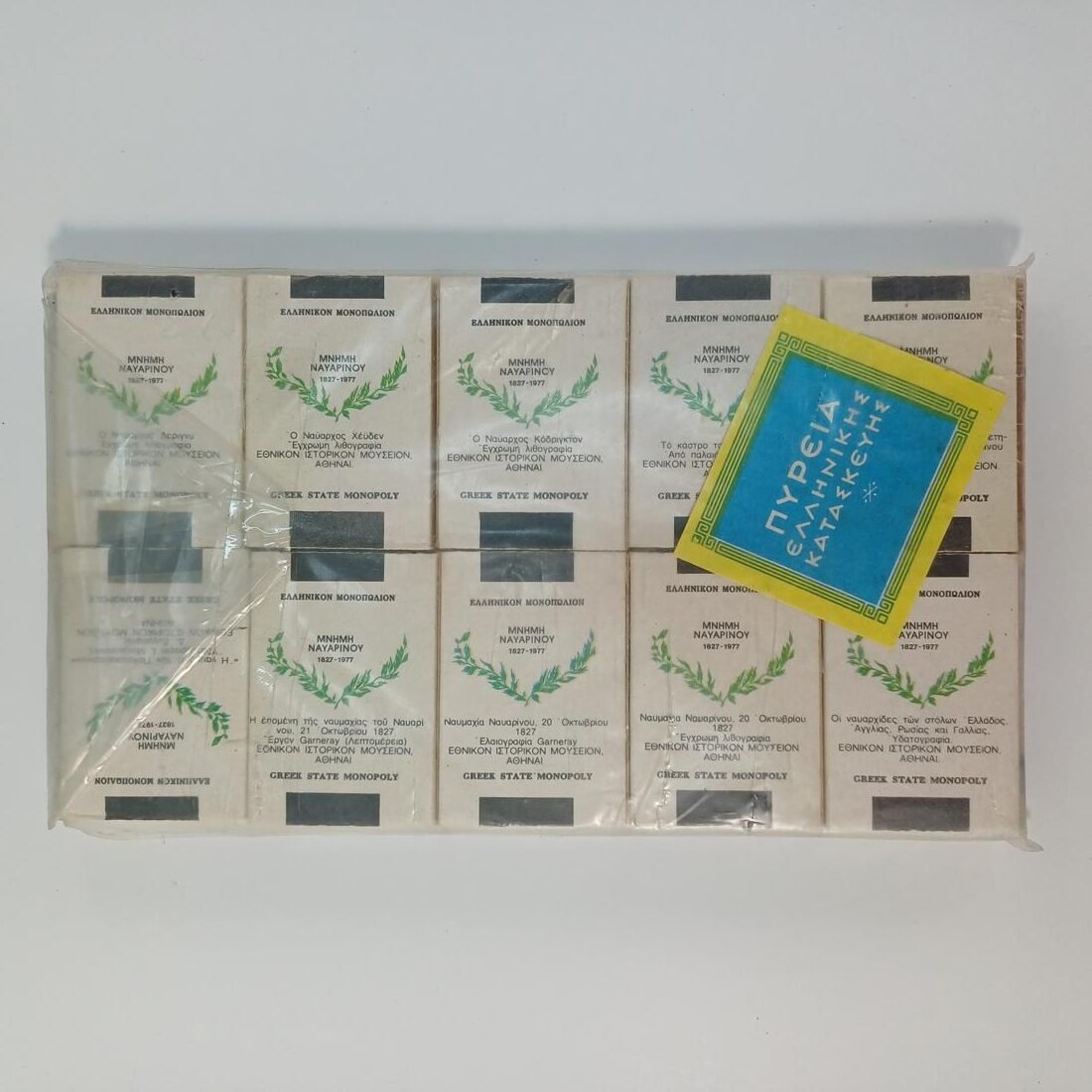 LOT 10 γεμάτων, σφραγισμένων κουτιών από σπίρτα με αφιέρωμα “Μνήμη Ναυαρίνου 1827-1977”. Τα κουτιά απεικονίζουν διάφορα έργα τέχνης όπως ελαιογραφίες, υδατογραφίες και λιθογραφίες με σκηνές και προσωπικότητες που σχετίζονται με τη Ναυμαχία του Ναυαρίνου.
