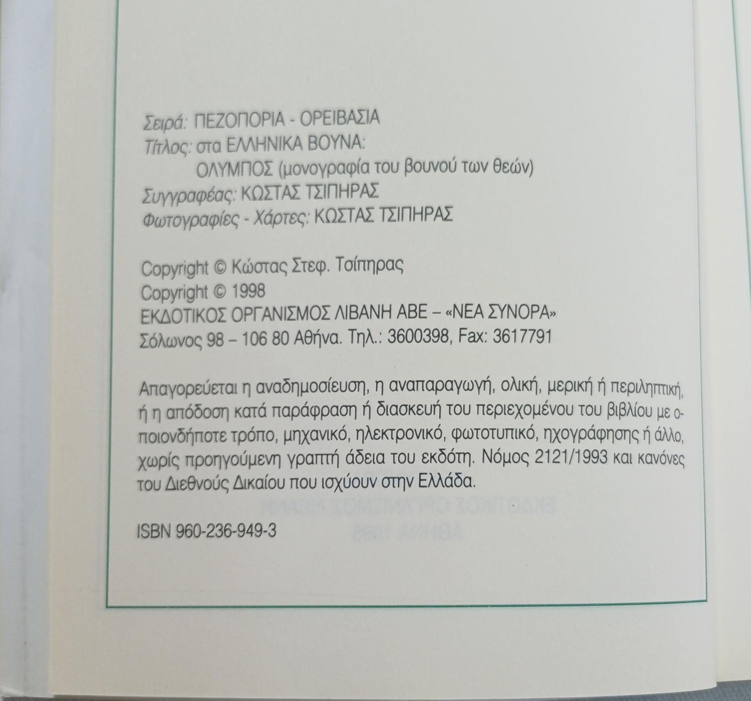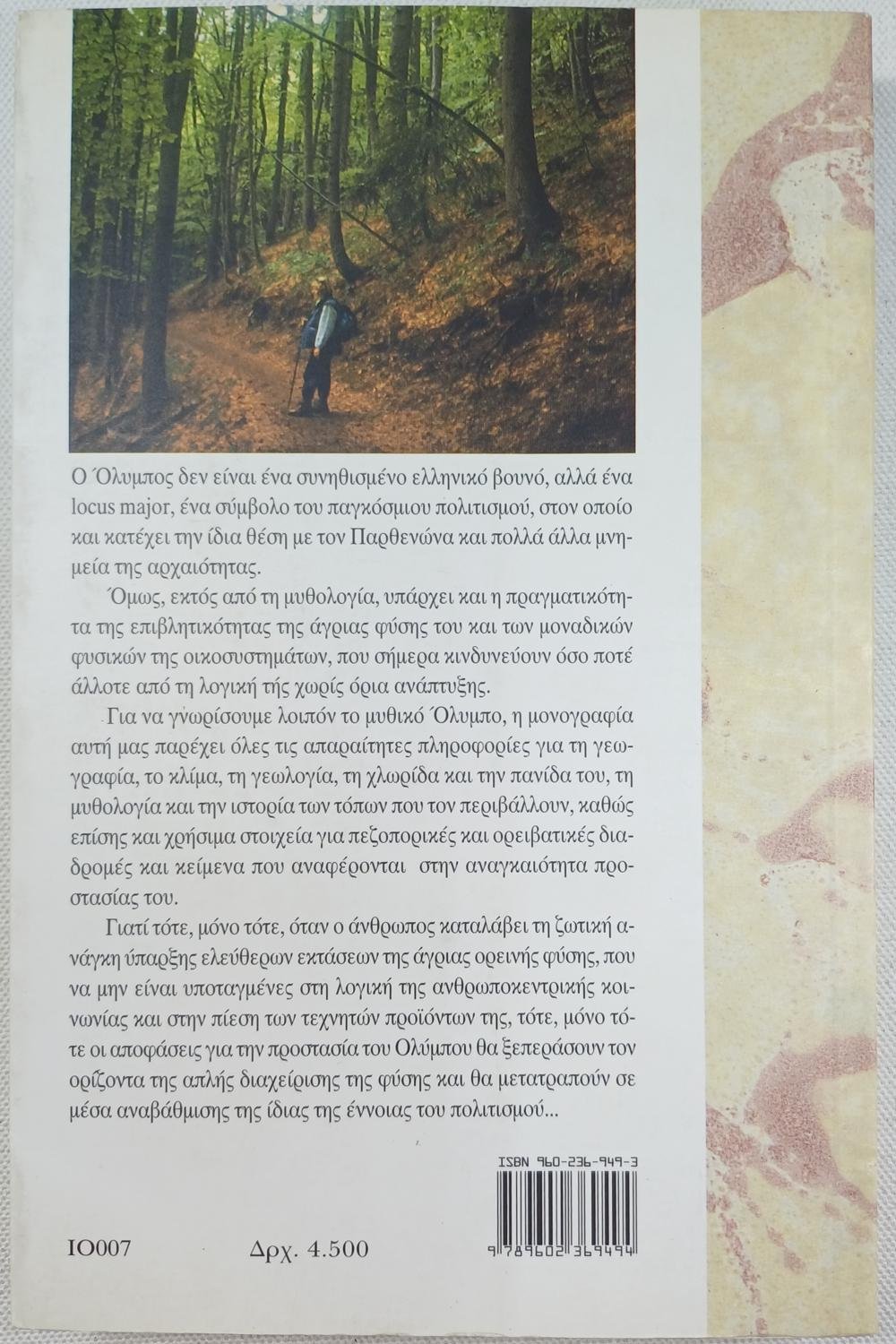Το βιβλίο «Στα ελληνικά βουνά: Όλυμπος (μονογραφία του βουνού των θεών)» του Κώστα Στεφ. Τσίπηρα εστιάζει στην πεζοπορία και την ορειβασία στον Όλυμπο. Το έργο του επιχειρεί να καταγράψει την πραγματικότητα της άγριας φύσης του βουνού, πέρα από τη μυθολογία, παρέχοντας πληροφορίες για την επιβίωση και την οικολογική του σημασία.