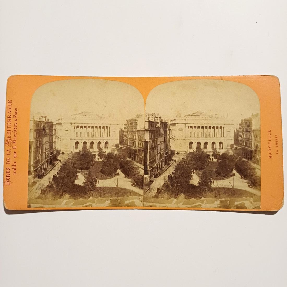 Η στερεοσκοπική φωτογραφία απεικονίζει τη Μασσαλία (Marseille) και το χρηματιστήριο “La Bourse” από την συλλογή “Bords de la Méditerranée” (Ακτές της Μεσογείου). Εκδόθηκε από τον Étienne Neurdein (1832–1918) (“Publié par E. Neurdein, Paris”), έναν από τους σημαντικότερους Γάλλους φωτογράφους και εκδότες καρτ ποστάλ της εποχής του. Μαζί με τον αδελφό του, Louis-Antonin, ίδρυσαν στο Παρίσι την εταιρεία Neurdein Frères (Αδελφοί Neurdein), η οποία κυριάρχησε στη γαλλική αγορά φωτογραφικών αναμνηστικών στα τέλη του 19ου και στις αρχές του 20ού αιώνα.