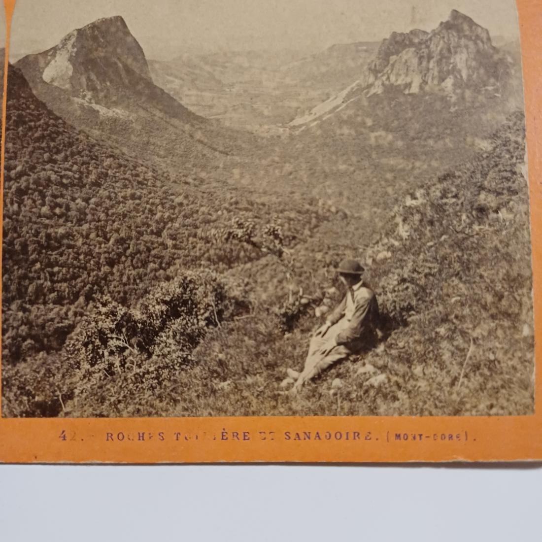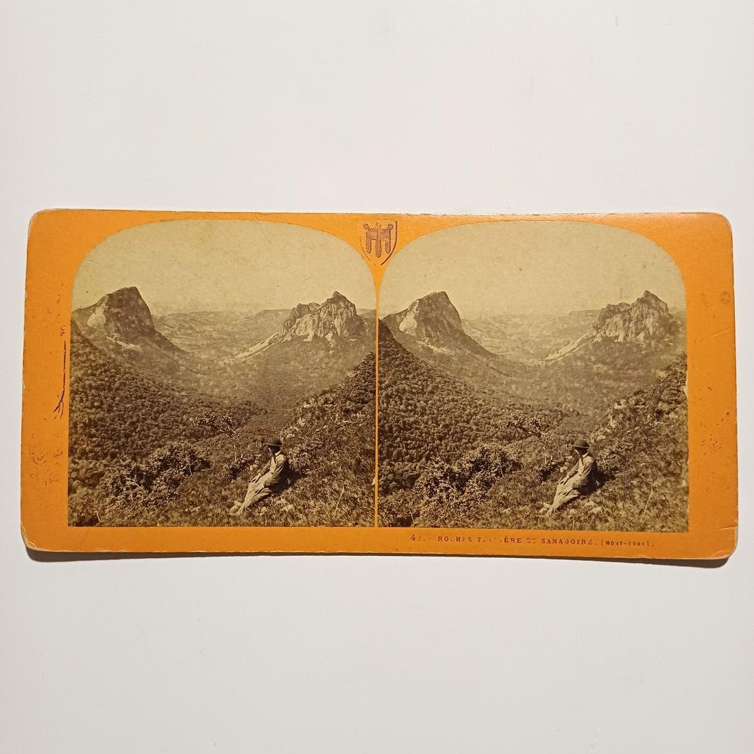 Η σπάνια στερεοσκοπική φωτογραφία απεικονίζει την περιοχή Roches Tuilière et Sanadoire στην οροσειρά Mont-Dore της Γαλλίας. Οι διαστάσεις της φωτογραφίας είναι 18 x 9 cm και χρονολογείται στα τέλη του 19ου – αρχές 20ού αιώνα.