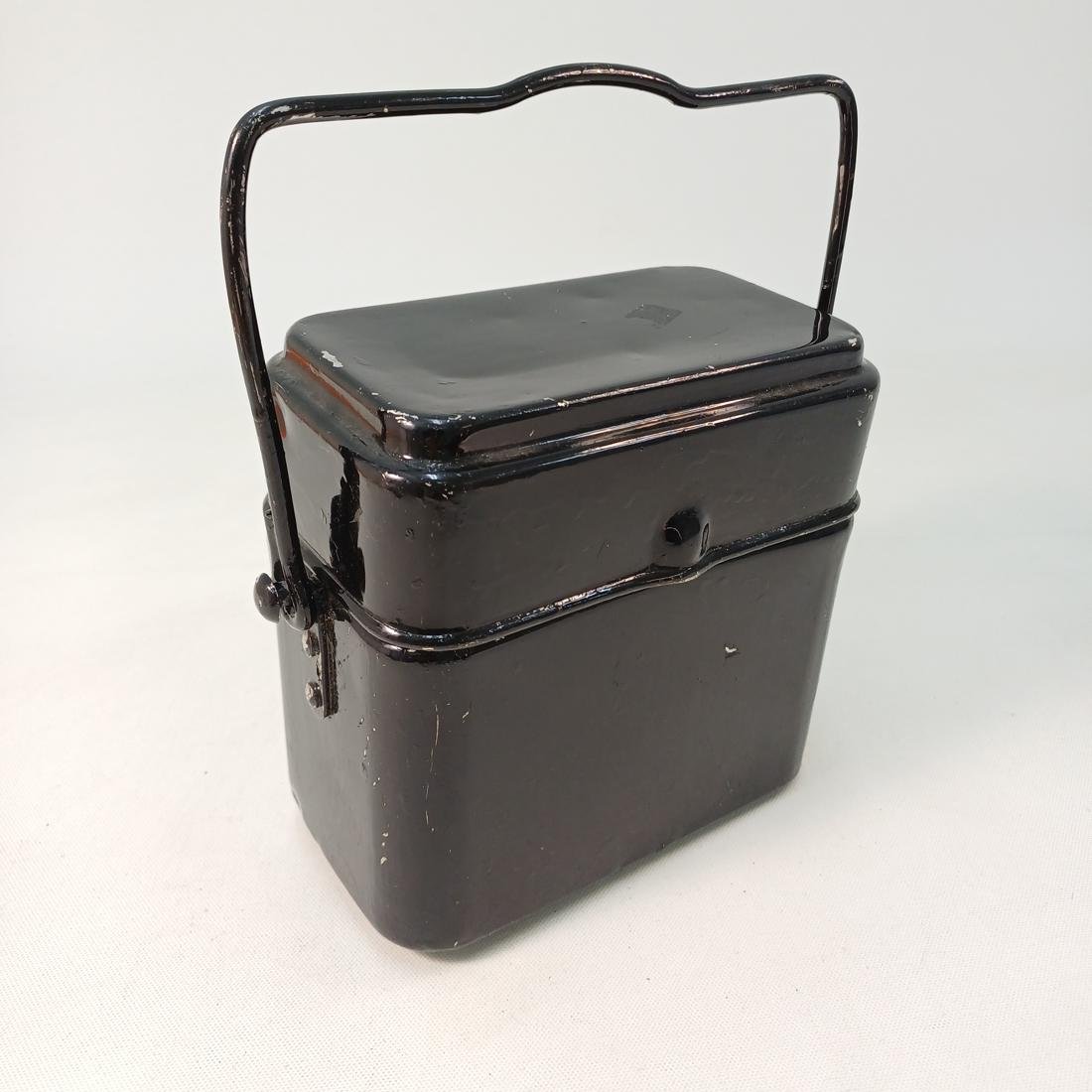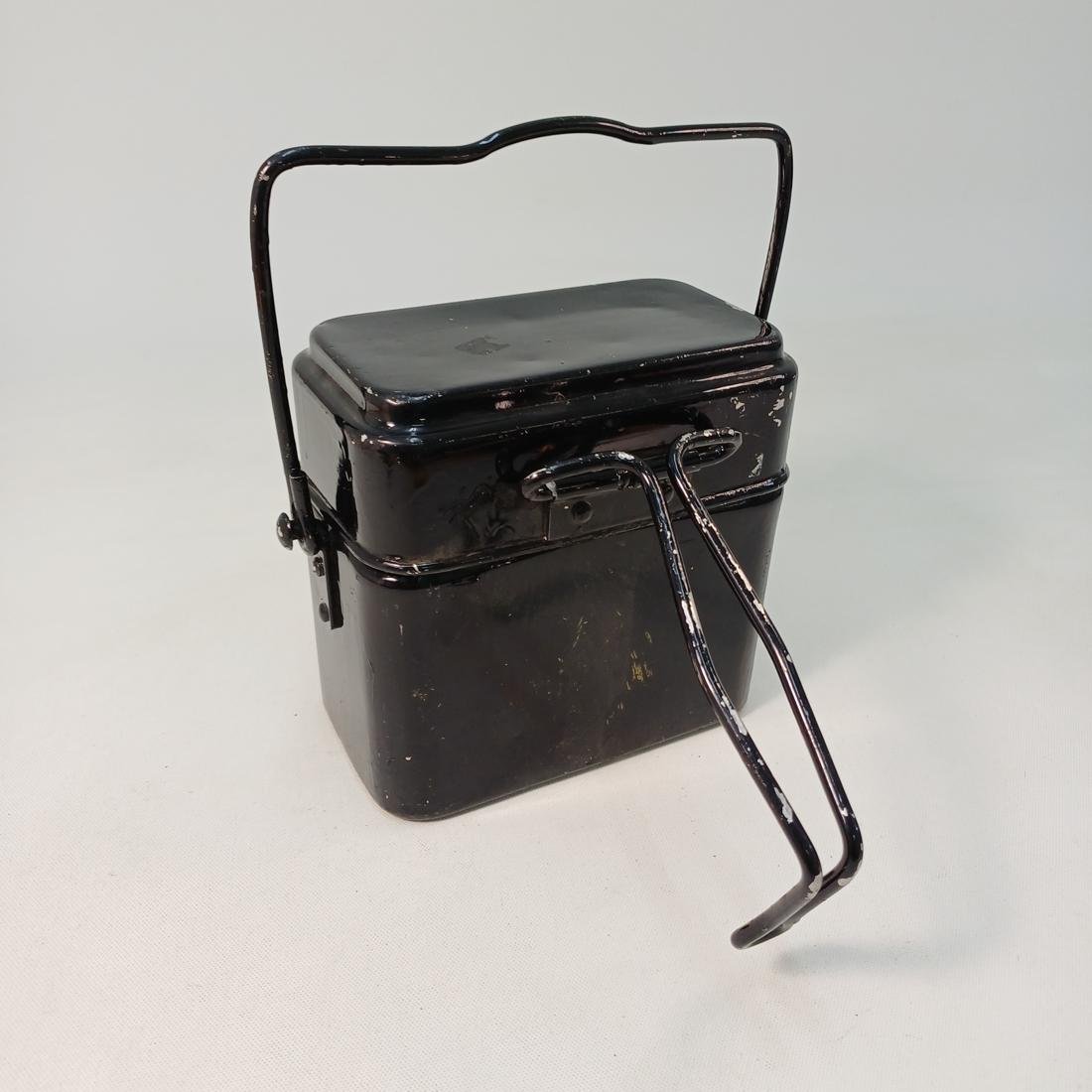 Στρατιωτική μεταλλική καραβάνα κατασκευασμένη στη Γαλλία. Στο κάτω μέρος φέρει σφραγίδα η οποία αναγράφει “Μ.Μ” ALUMINUM PQR.