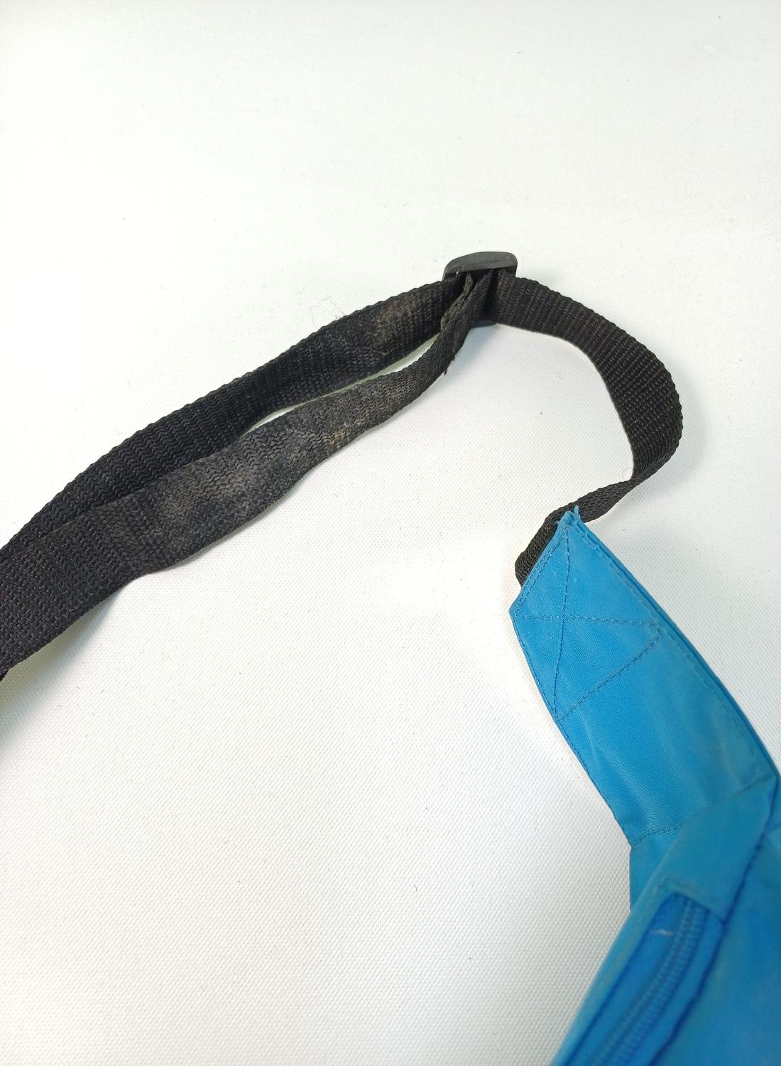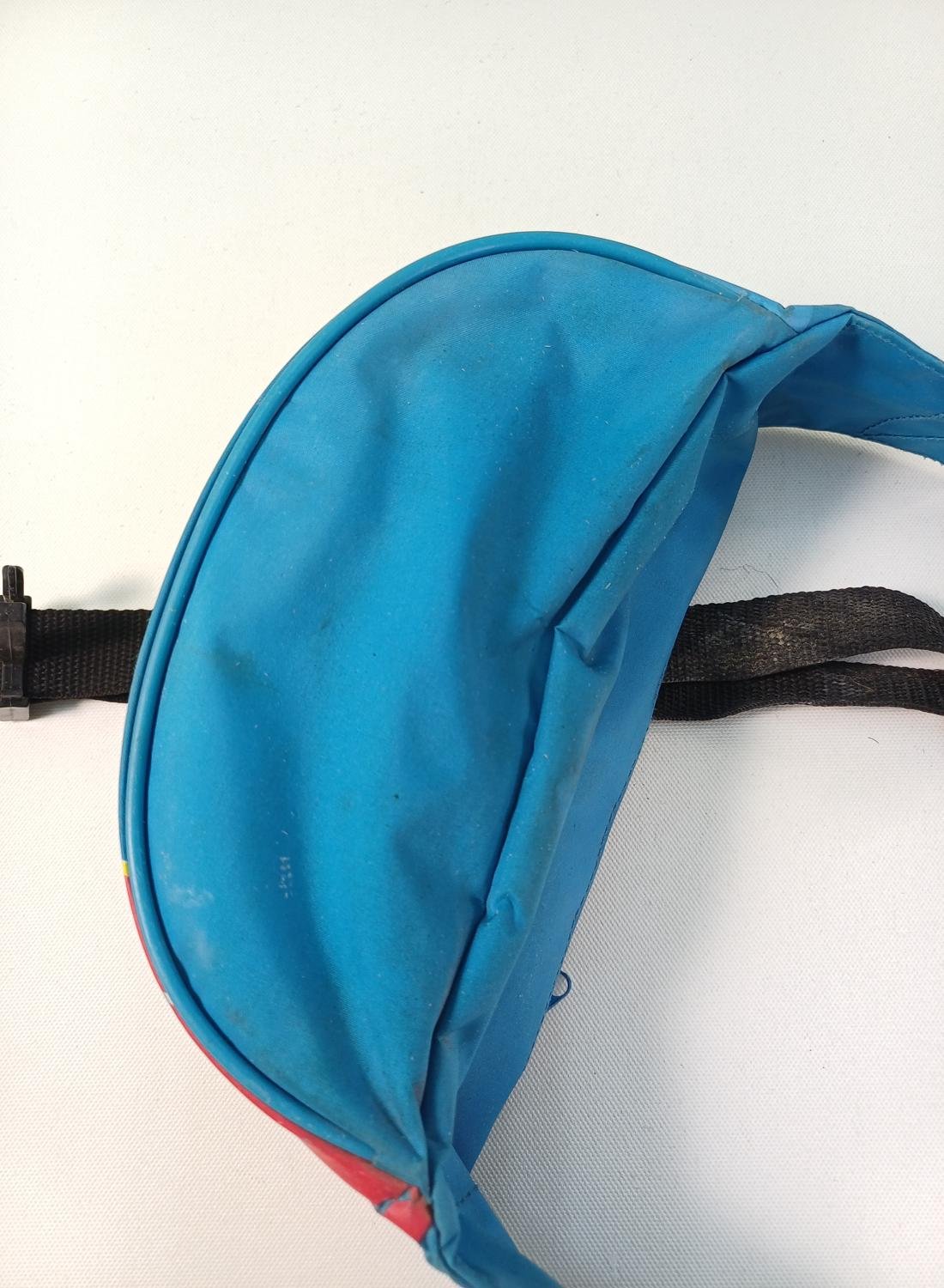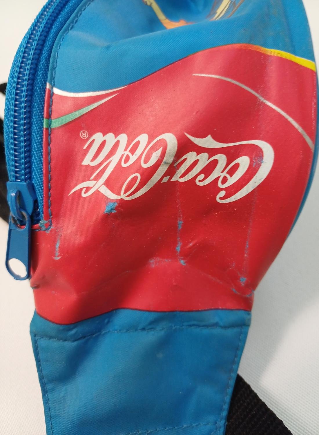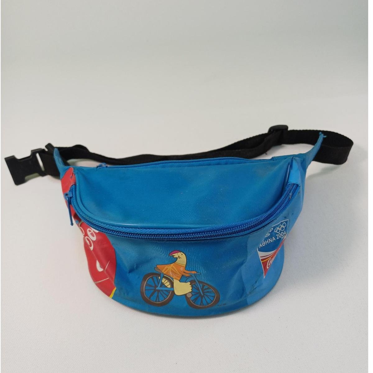 Συλλεκτικό τσαντάκι μέσης, ενθύμιο από τους Ολυμπιακούς Αγώνες της Αθήνας το 2004. Απεικονίζεται η μασκότ “Αθηνά” να κάνει ποδήλατο. Το τσαντάκι είναι μεταχειρισμένο και έχει φθορές (είναι σπασμένο το ένα δόντι από το κουμπί κλεισίματος και υπάρχει φθορά στα τυπωμένα χρώματα των χορηγών)