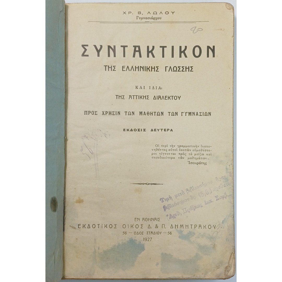 Το “Συντακτικόν της Ελληνικής Γλώσσης και Ιδία της Αττικής Διαλέκτου” του Χρ. Β. Λώλου είναι ένα παλαιό, συλλεκτικό σχολικό εγχειρίδιο Αρχαίων Ελληνικών, που εκδόθηκε το 1927. Αυτή η δεύτερη έκδοση του βιβλίου χρησίμευε ως διδακτικό βοήθημα για τους μαθητές των Γυμνασίων, εστιάζοντας στους κανόνες σύνταξης της αττικής διαλέκτου.