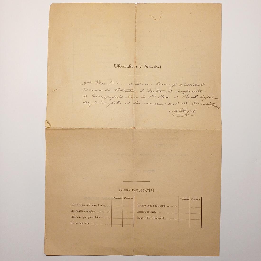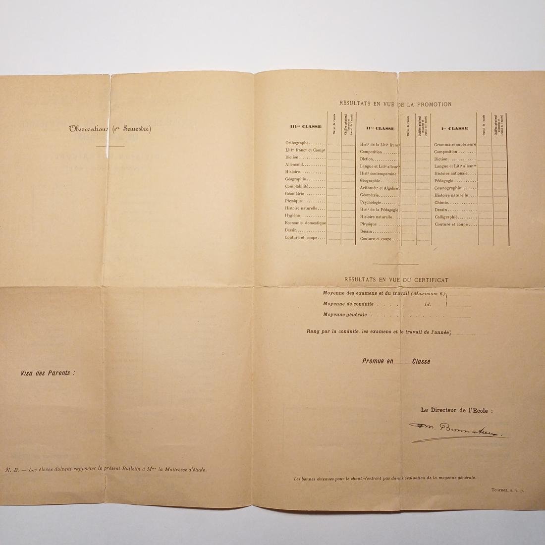 Σχολικός έλεγχος προόδου (bulletin scolaire) από το γαλλικό Σχολείο Δευτεροβάθμιας και Ανώτερης Εκπαίδευσης Θηλέων (École Secondaire et Supérieure des Jeunes Filles) ακαδημαϊκού έτους 1890-1891. Αφορά τη «Μεγάλη Τάξη» (Division Supérieure) και συγκεκριμένα μια μαθήτρια της 1ης τάξης, στην οποία καταγράφονται βαθμολογίες για μαθήματα όπως η Γαλλική Σύνθεση, η Γραμματική, η Κοπτική-Ραπτική και η Παιδαγωγική, ενώ το πρόγραμμα σπουδών περιλαμβάνει έναν συνδυασμό κλασικών μαθημάτων (Ιστορία, Γεωμετρία, Φυσική), τεχνών (Σχέδιο, Μουσική) και πρακτικών δεξιοτήτων (Οικιακή Οικονομία, Υγιεινή, Λογιστική).