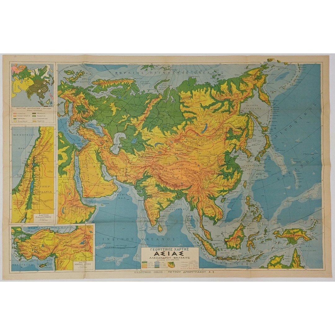 Σχολικός χάρτης “Γεωφυσικός Χάρτης Ασίας” στα μέσα του 20ού αιώνα. Εκδόθηκε από τον εκδοτικό οίκο Πέτρου Δημητράκου Α.Ε., ενώ την επιστημονική επιμέλεια είχε ο Αλέξανδρος Φαλτάιτς. Ο χάρτης χρησιμοποιεί έντονη χρωματική διαβάθμιση για να αναδείξει το ανάγλυφο της ηπείρου (βουνά, πεδιάδες, οροπέδια) και περιλαμβάνει σημαντικούς δευτερεύοντες χάρτες στην αριστερή πλευρά, όπως λεπτομερείς απεικονίσεις της Παλαιστίνης και της Μικράς Ασίας.