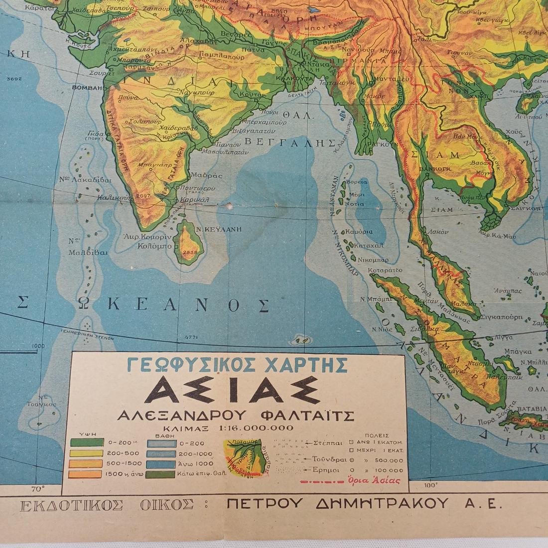 Σχολικός χάρτης “Γεωφυσικός Χάρτης Ασίας” στα μέσα του 20ού αιώνα. Εκδόθηκε από τον εκδοτικό οίκο Πέτρου Δημητράκου Α.Ε., ενώ την επιστημονική επιμέλεια είχε ο Αλέξανδρος Φαλτάιτς