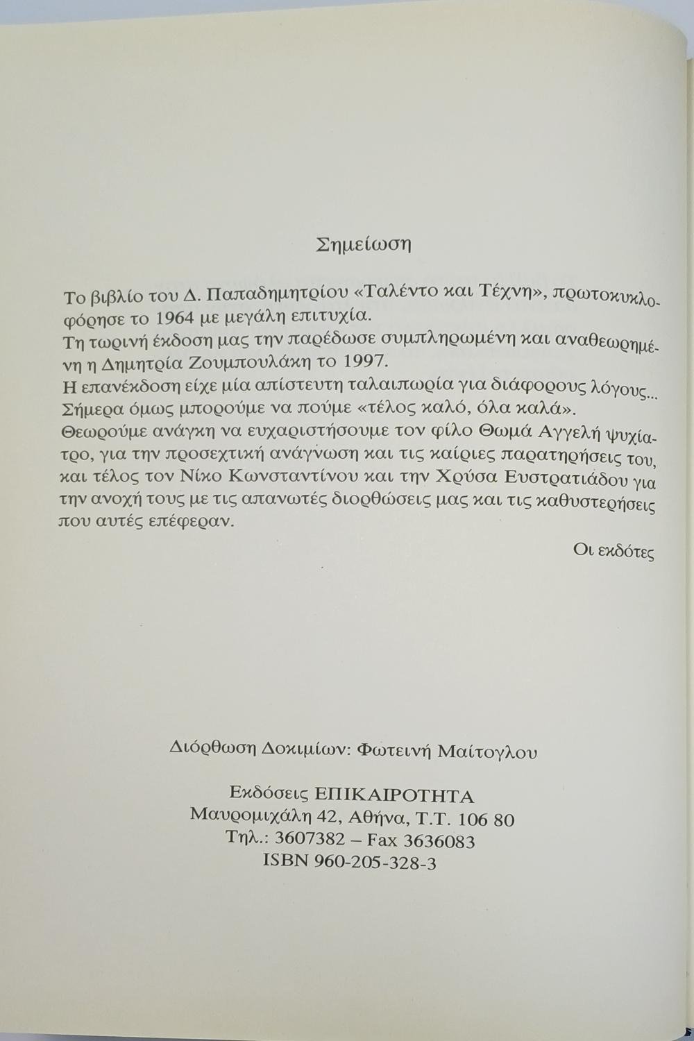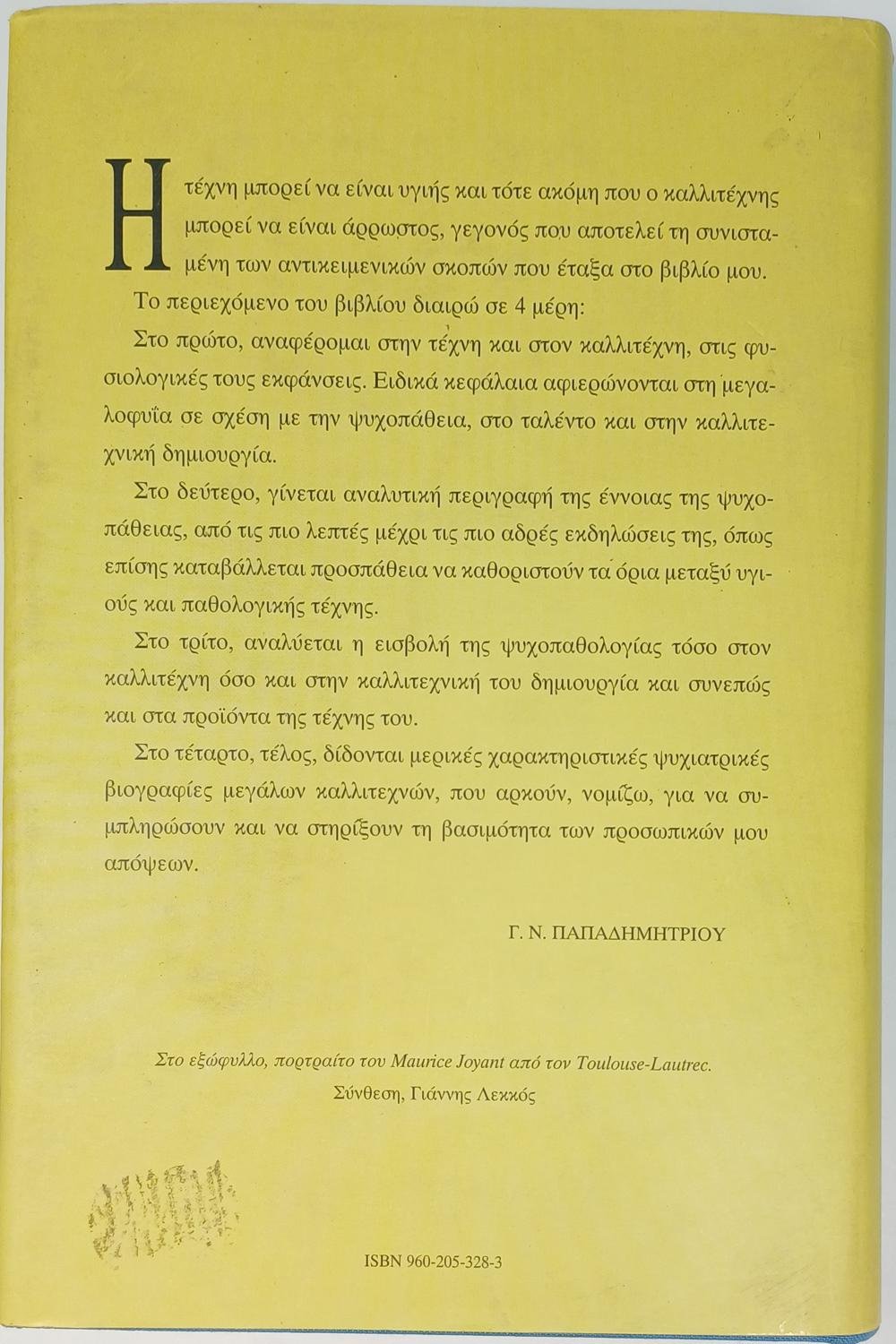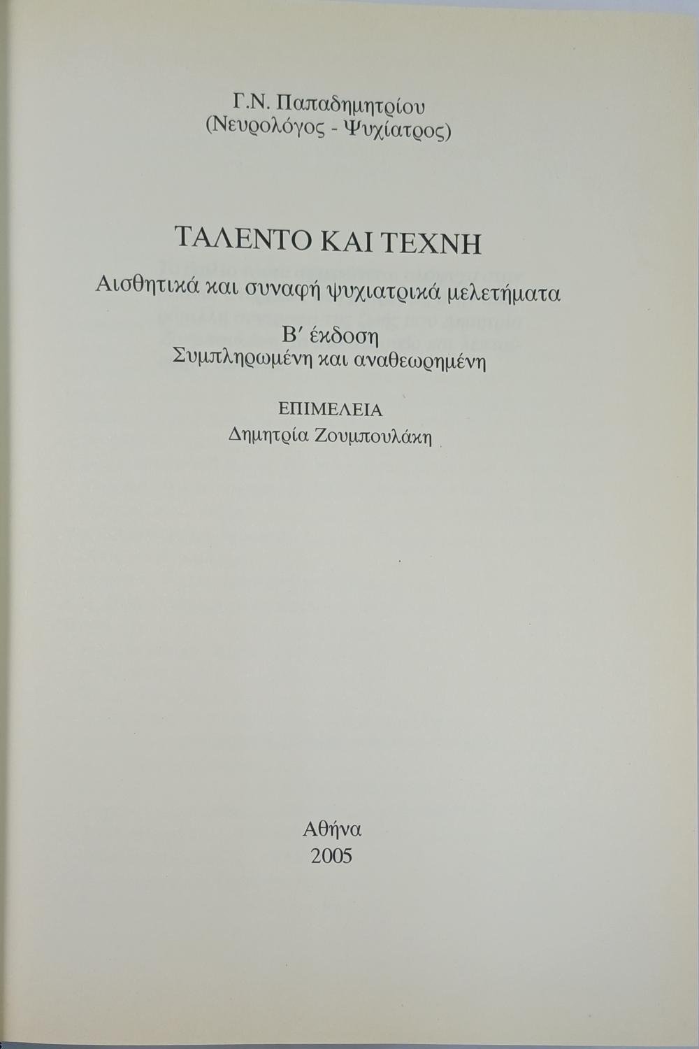 Το βιβλίο “Ταλέντο και Τέχνη: Αισθητικά και συναφή ψυχιατρικά μελετήματα” του Γ. Ν. Παπαδημητρίου, αποτελεί μια σε βάθος μελέτη της σύνδεσης μεταξύ της καλλιτεχνικής δημιουργίας και της ψυχοπαθολογίας. Το έργο, είναι δομημένο σε τέσσερα μέρη, αναλύοντας τις έννοιες της τέχνης, του καλλιτέχνη και της ψυχοπαθολογίας, εξετάζοντας πώς οι ψυχικές διαταραχές μπορούν να επηρεάσουν το δημιουργικό έργο.