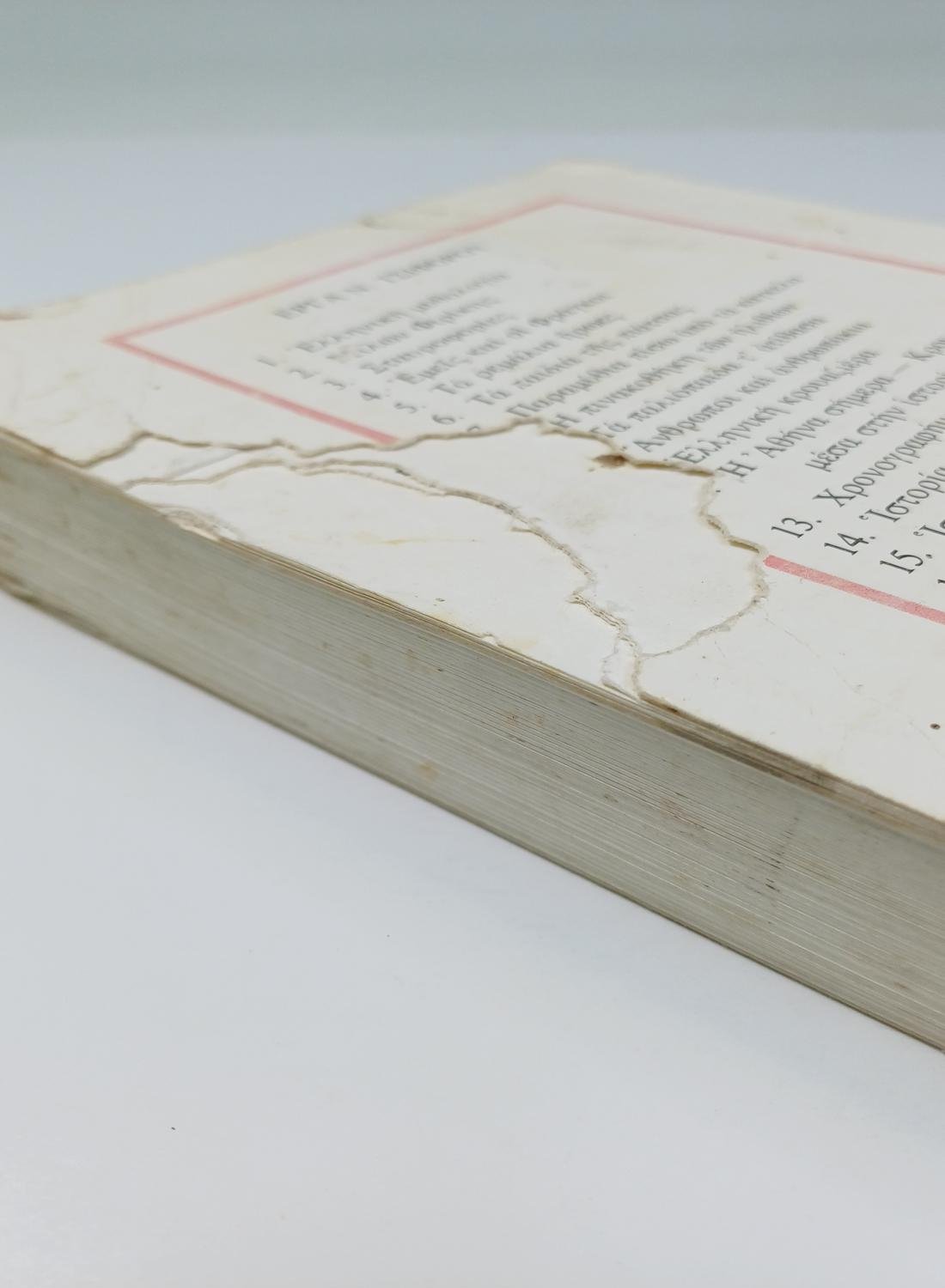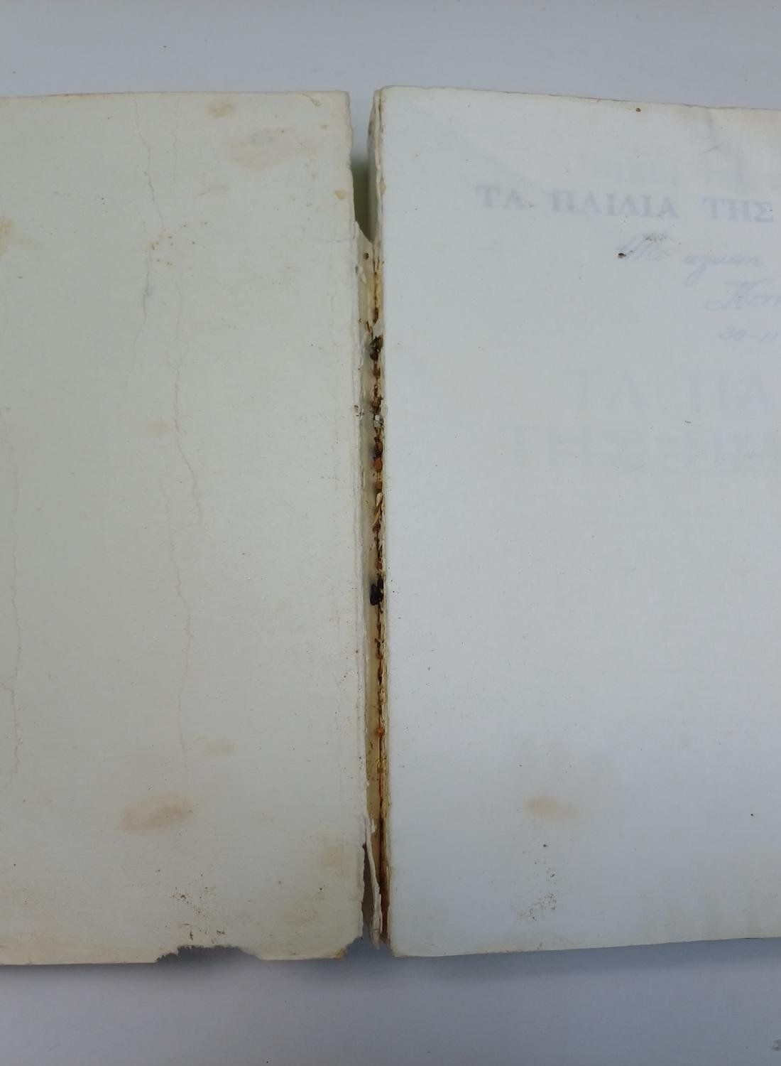 Το βιβλίο είναι μεταχειρισμένο και φθαρμένο λόγω χρήσης και παλαιότητας. Έχει ορισμένα σκισίματα στο πίσω μέρος και τσαλακώματα σε κάποιες σελίδες. Υπάρχει παρουσία υγρασίας στα φύλλα και εν μέρει αποκόλληση στη ράχη. Φέρει αφιέρωση προηγούμενου ιδιοκτήτη στην εισαγωγική σελίδα.