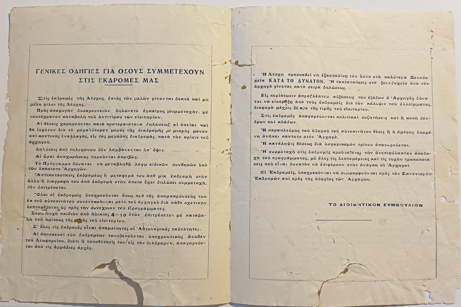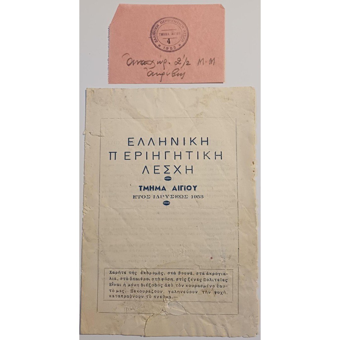 Το τμήμα Αιγίου της Ελληνικής Περιηγητικής Λέσχης εξέδωσε φυλλάδιο στο οποίο αναφέρει τους κανόνες συμμετοχής στις εκδρομές που διοργανώνει . Περιέχεται και εν απόκομμα εισιτήριου που φέρει την σφραγίδα του τμήματος το οποίο ιδρύθηκε το 1953.