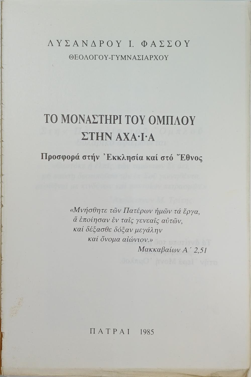 Το βιβλίο «Το μοναστήρι του Ομπλού στην Αχαΐα», γραμμένο από τον θεολόγο και γυμνασιάρχη Λύσσανδρο Ι. Φάσσο και εκδοθέν στην Πάτρα το 1985, αποτελεί μια ιστορική μελέτη αφιερωμένη στην Ιερά Μονή Ομπλού. Η έκδοση αυτή αναδεικνύει την προσφορά του μοναστηριού τόσο στην Ορθόδοξη Εκκλησία όσο και στο ελληνικό έθνος, εστιάζοντας ιδιαίτερα στον ρόλο που διαδραμάτισε η μονή κατά τους χρόνους της Τουρκοκρατίας και κατά την Επανάσταση του 1821.