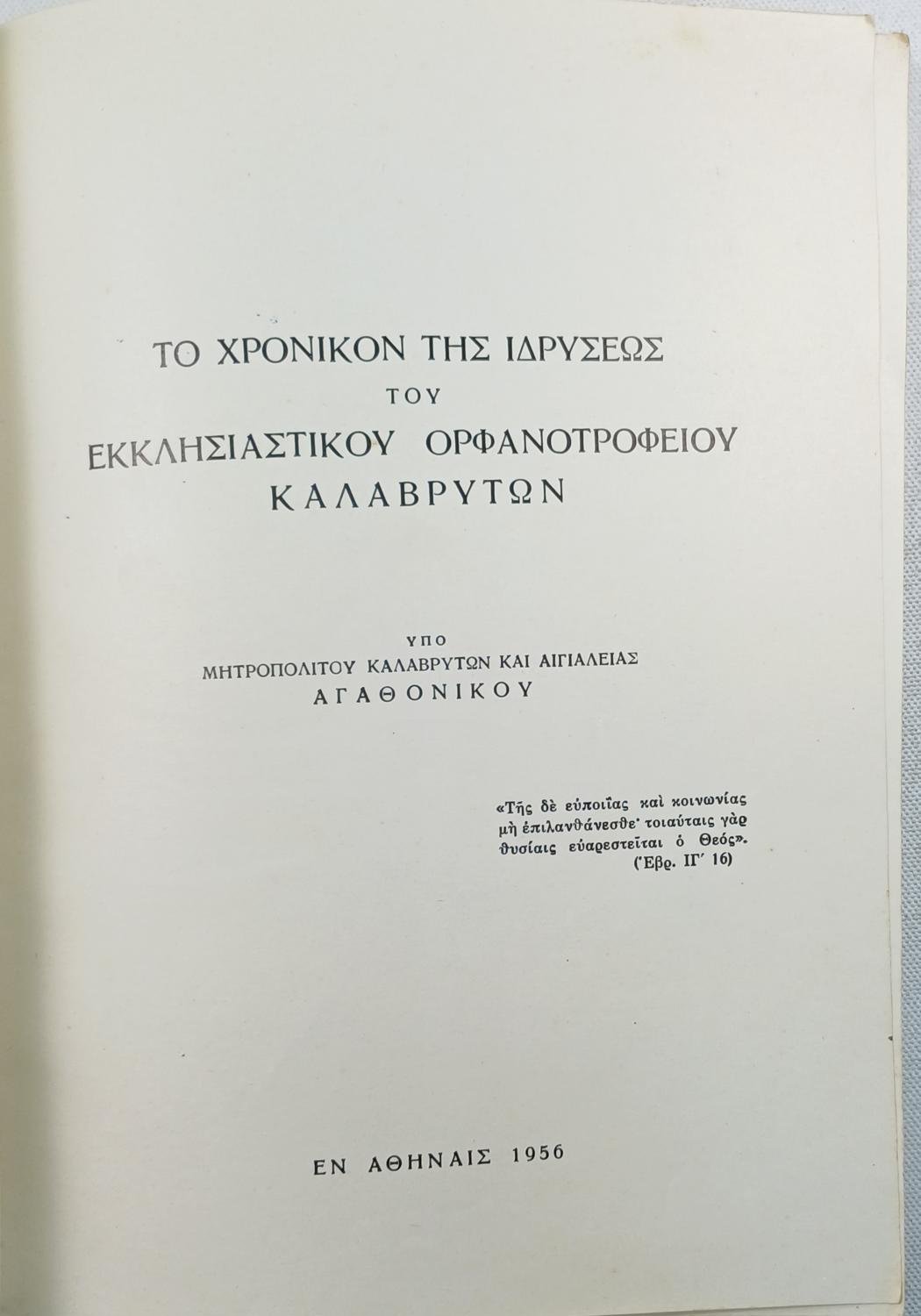 “Το Χρονικόν της Ιδρύσεως του Εκκλησιαστικού Ορφανοτροφείου Καλαβρύτων” (1956)