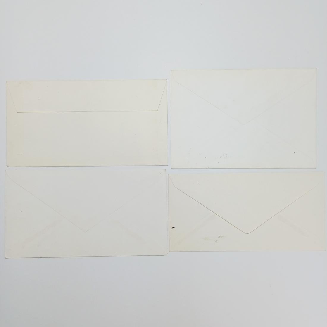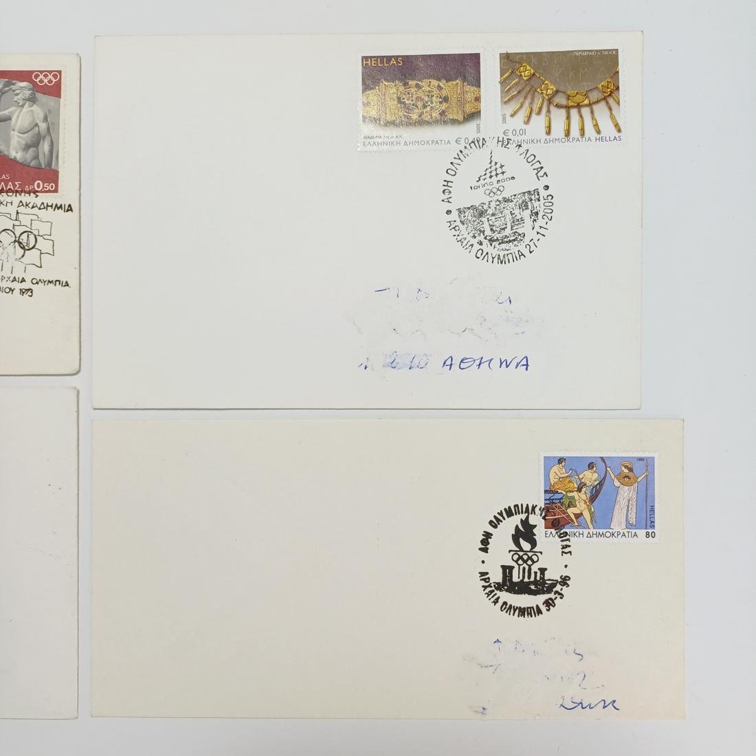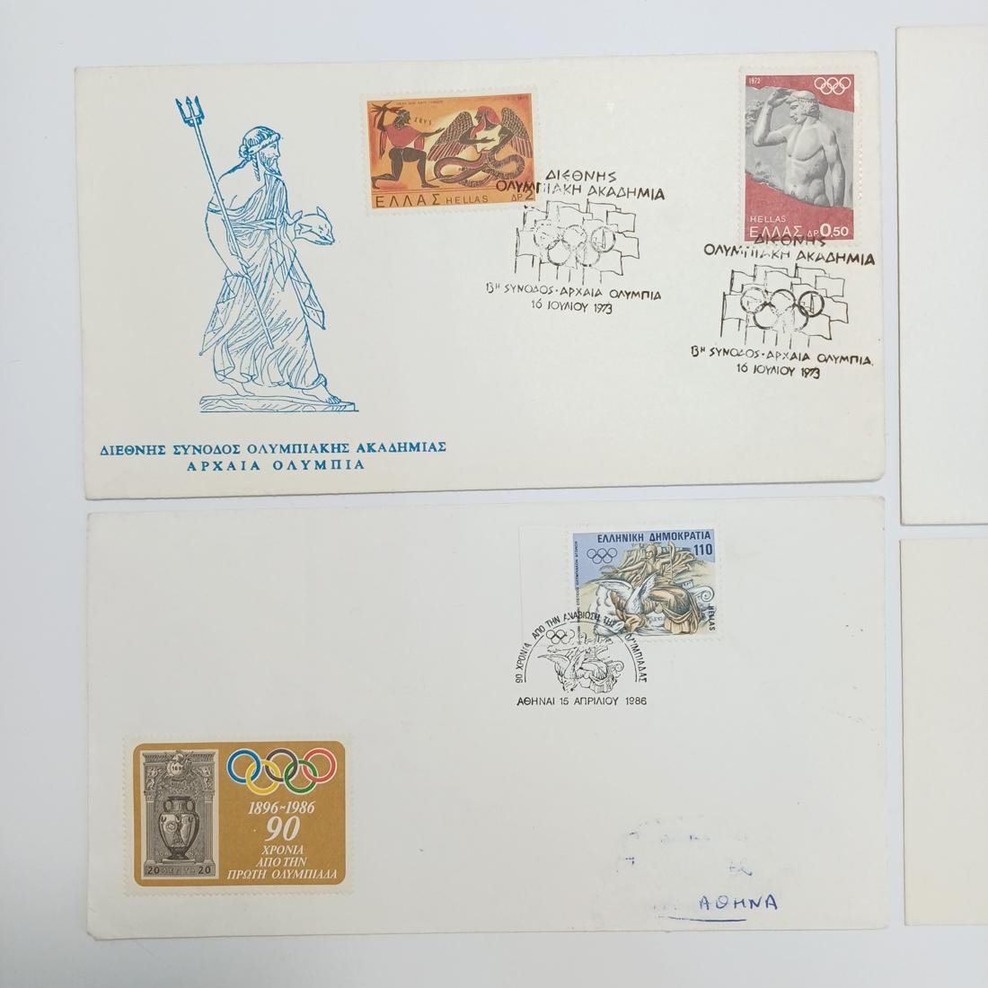 Ο κάτω φάκελος στα αριστερά είναι μια έκδοση του 1986 για τον εορτασμό των 100 χρόνων (1896-1986) από την αναβίωση των πρώτων σύγχρονων Ολυμπιακών Αγώνων στην Αθήνα, φέροντας αναμνηστική σφραγίδα με ημερομηνία 15 Απριλίου 1986 και γραμματόσημο που απεικονίζει το έμβλημα των αγώνων.