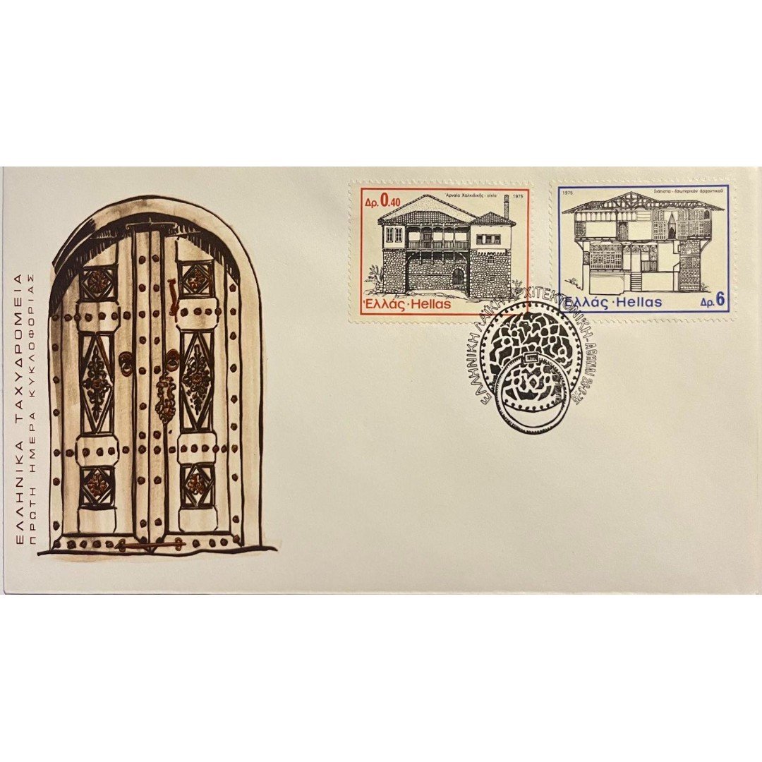 Φάκελος πρώτης ημέρας κυκλοφορίας, που εκδόθηκε από τα Ελληνικά Ταχυδρομεία το 1975.Ο φάκελος περιλαμβάνει δύο γραμματόσημα αξίας 0.40 και 6 δραχμών αντίστοιχα με θέμα στην Ελληνική Λαϊκή Αρχιτεκτονική. Τα γραμματόσημα απεικονίζουν παραδοσιακά κτίρια. Η ημερομηνία σφραγίδας είναι 26-6-1975 και η τοποθεσία είναι Αθήνα.