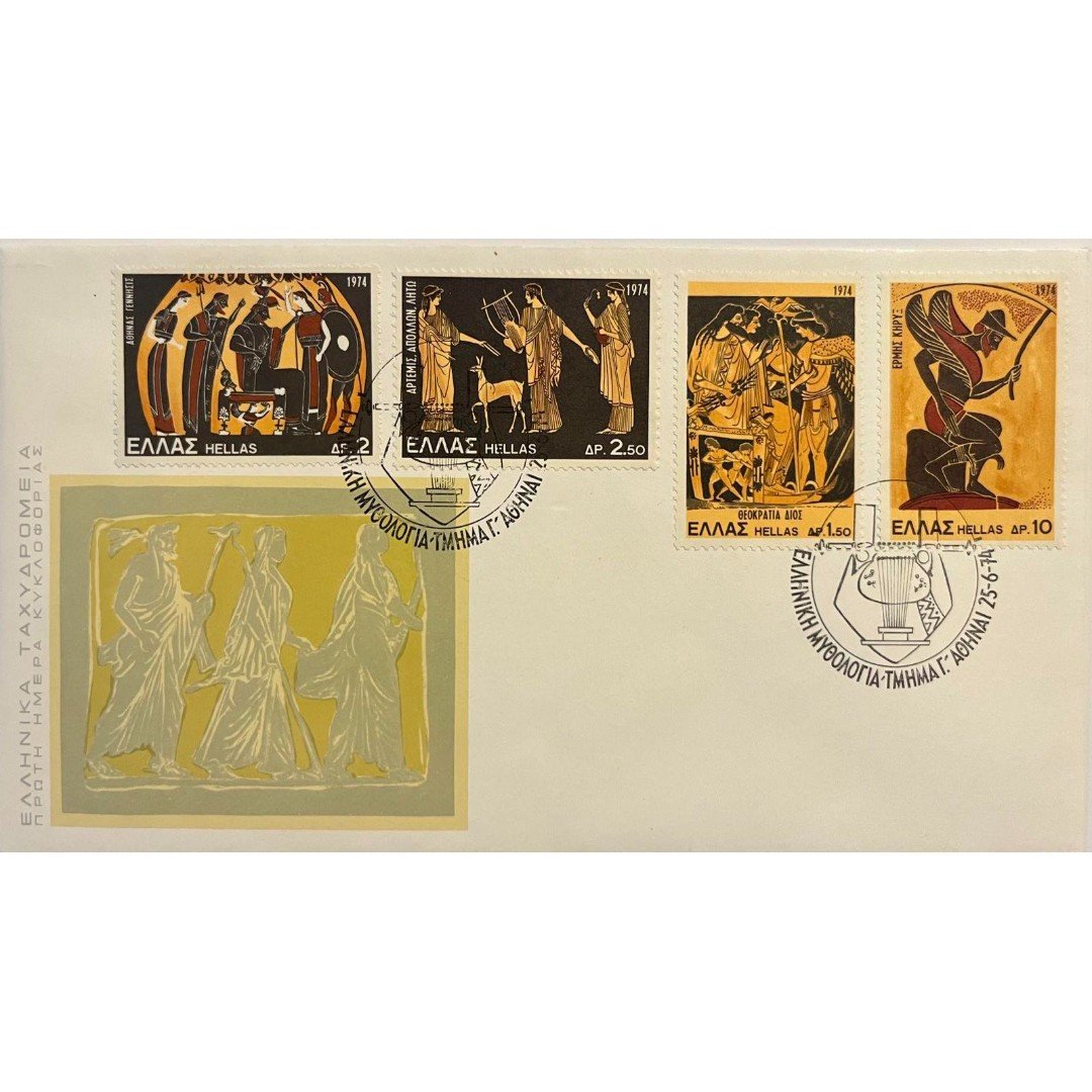 Φάκελος φιλοτελισμού Πρώτης Ημέρας Κυκλοφορίας που εκδόθηκε από τα Ελληνικά Ταχυδρομεία το 1974. Ο φάκελος περιλαμβάνει τέσσερα γραμματόσημα αξίας 2, 2.50, 1.50 και 10 δραχμών αντίστοιχα με θέμα “ΕΛΛΗΝΙΚΗ ΜΥΘΟΛΟΓΙΑ ΤΜΗΜΑ Γ΄”. Τα γραμματόσημα απεικονίζουν αρχαίες ελληνικές παραστάσεις αγγείων με διάφορες θεότητες και σκηνές. Η ημερομηνία σφραγίδας είναι 25-6-1974 και η τοποθεσία είναι Αθήνα.