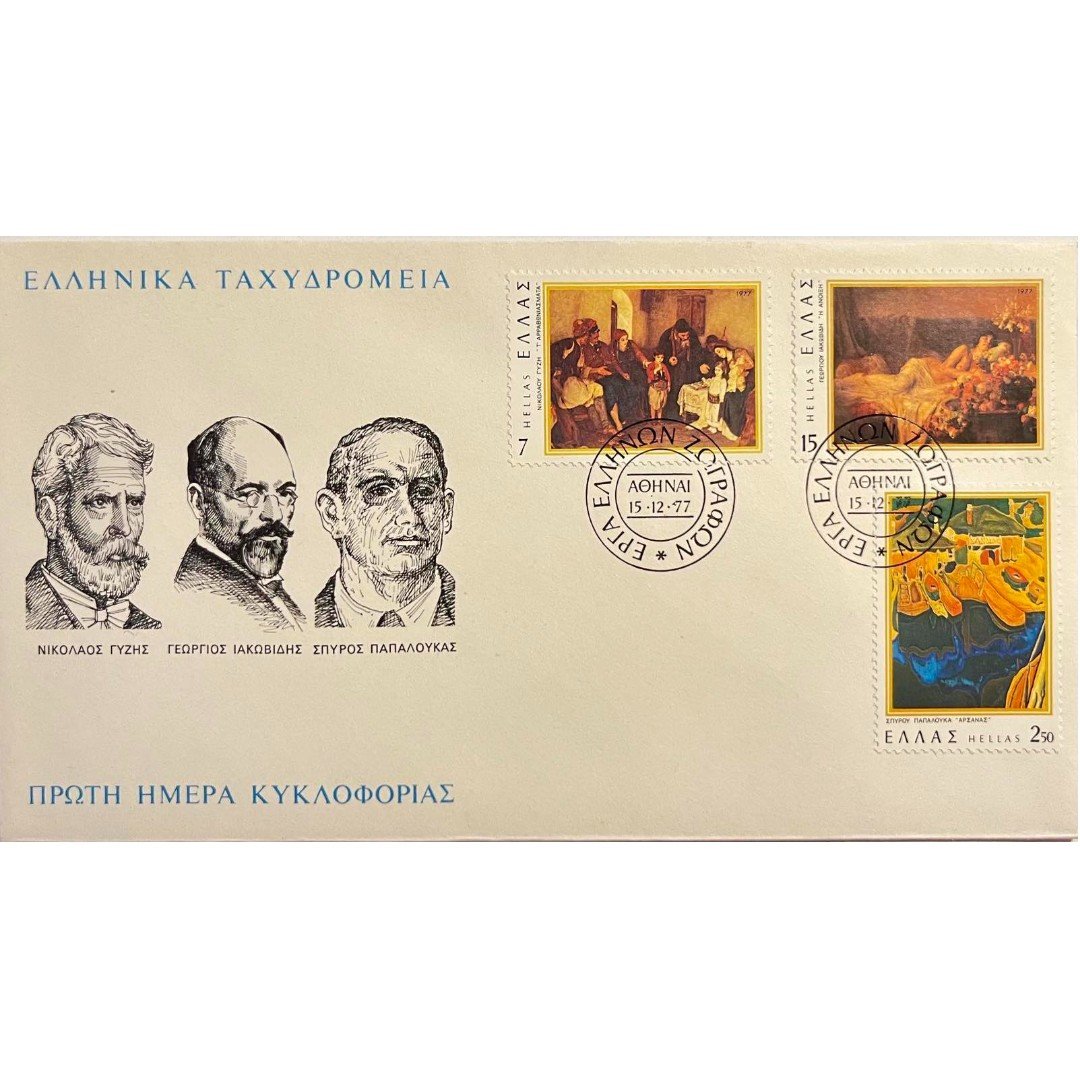 Φάκελος φιλοτελισμού πρώτης ημέρας κυκλοφορίας, που εκδόθηκε από τα Ελληνικά Ταχυδρομεία το 1977. Ο φάκελος περιλαμβάνει τρία γραμματόσημα αξίας 7, 15 και 2.50 δραχμών αντίστοιχα με θέμα Έργα Ελλήνων ζωγράφων. Τα γραμματόσημα απεικονίζουν επιλεγμένα έργα σημαντικών Ελλήνων καλλιτεχνών: το έργο «Αρραβωνιάσματα» του Νικόλαου Γύζη, το έργο «Η άνοιξη» του Γεωργίου Ιακωβίδη και το έργο «Αρσανάς» του Σπύρου Παπαλουκά. Η ημερομηνία σφραγίδας είναι 15-12-1977 και η τοποθεσία είναι Αθήνα.