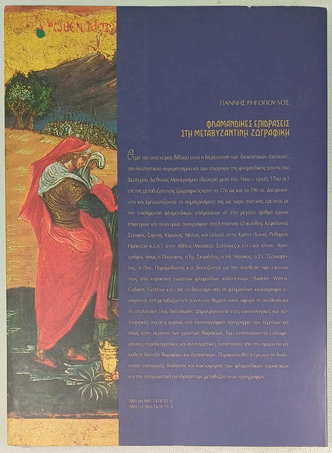 Το βιβλίο του Γιάννη Ρηγόπουλου «Φλαμανδικές επιδράσεις στη μεταβυζαντινή ζωγραφική: Προβλήματα πολιτιστικού συγκριτισμού, Α΄ Τόμος», διερευνά τις διαεικαστικές σχέσεις και τις επιρροές της φλαμανδικής τέχνης του δεύτερου μισού του 16ου και των αρχών του 17ου αιώνα στη μεταβυζαντινή ζωγραφική, καλύπτοντας την περίοδο από τον 17ο έως και τον 19ο αιώνα. Η μελέτη διευρύνει και εμπλουτίζει τα συμπεράσματα της μέχρι τώρα σχετικής έρευνας, εστιάζοντας στον τρόπο με τον οποίο ενσωματώθηκαν φλαμανδικά στοιχεία και πρότυπα στην ορθόδοξη αγιογραφία, αποτελώντας έτσι ένα σημαντικό έργο για τον πολιτιστικό συγκρητισμό των δύο παραδόσεων.