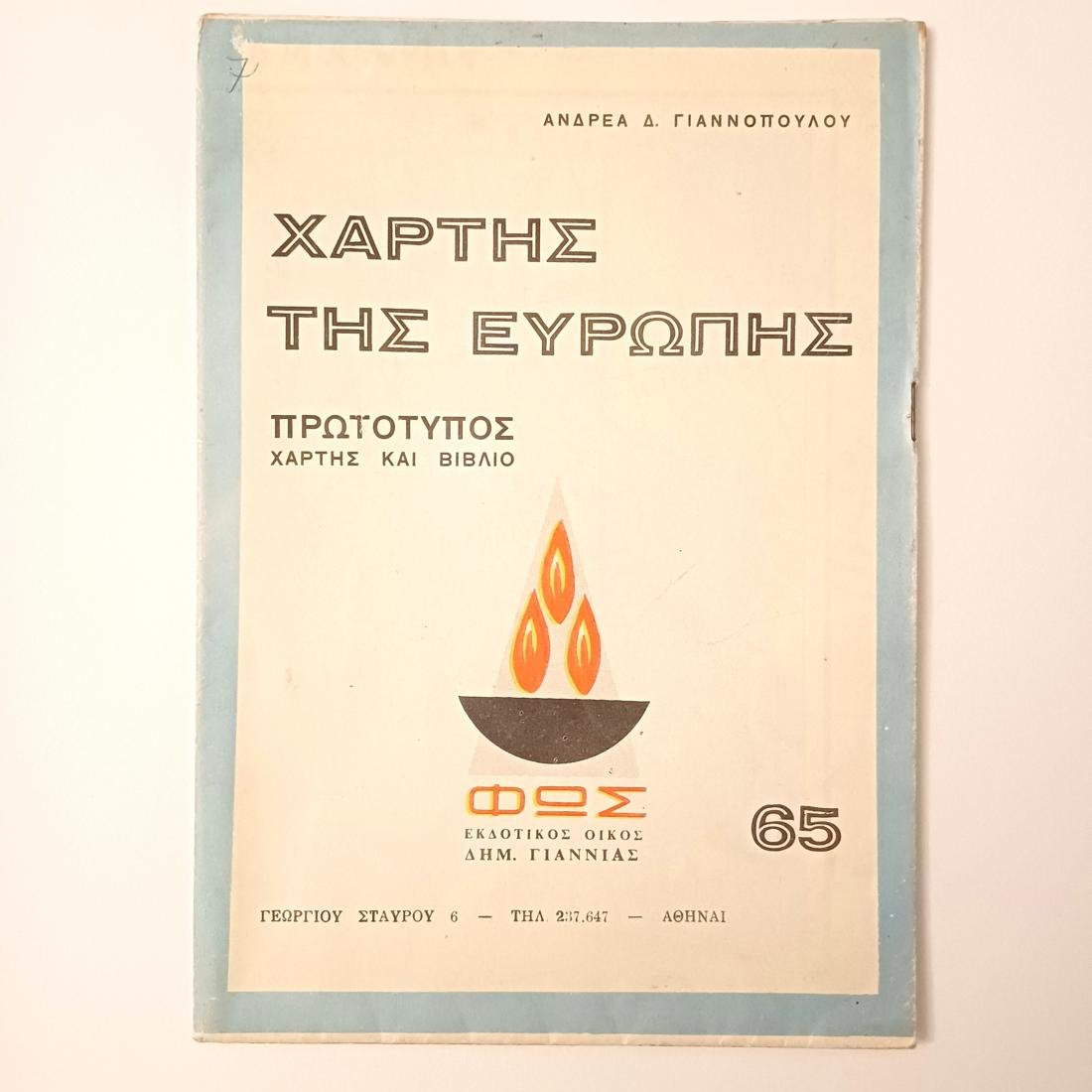 Χάρτης μεταπολεμικής περιόδου “Χάρτης της Ευρώπης” του Ανδρέα Δ. Γιαννόπουλου, αριθμού 65, έκδοση του εκδοτικού οίκου “Φως” (Δημ. Γιαννιάς), στην Αθήνα. Αποτελεί μέρος μιας ευρύτερης σειράς γεωγραφικών βοηθημάτων που περιελάμβανε και τον «Χάρτη των Ηπείρων». Η έκδοση χαρακτηρίζεται ως «Πρωτότυπος Χάρτης και Βιβλίο», καθώς συνδυάζει χαρτογραφικό υλικό με επεξηγηματικά κείμενα, γεγονός που το καθιστά ενδιαφέρον συλλεκτικό αντικείμενο στην κατηγορία των ταξιδιωτικών και γεωγραφικών εκδόσεων.