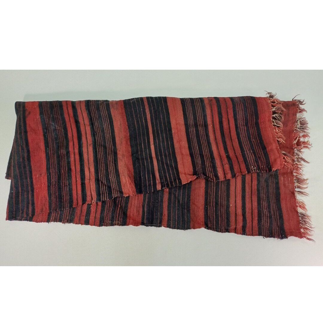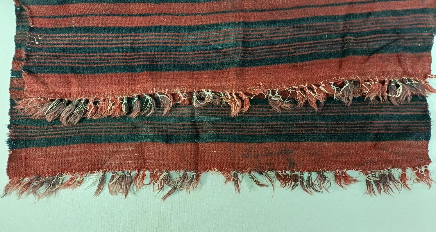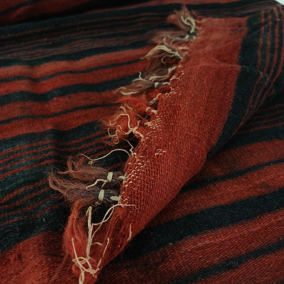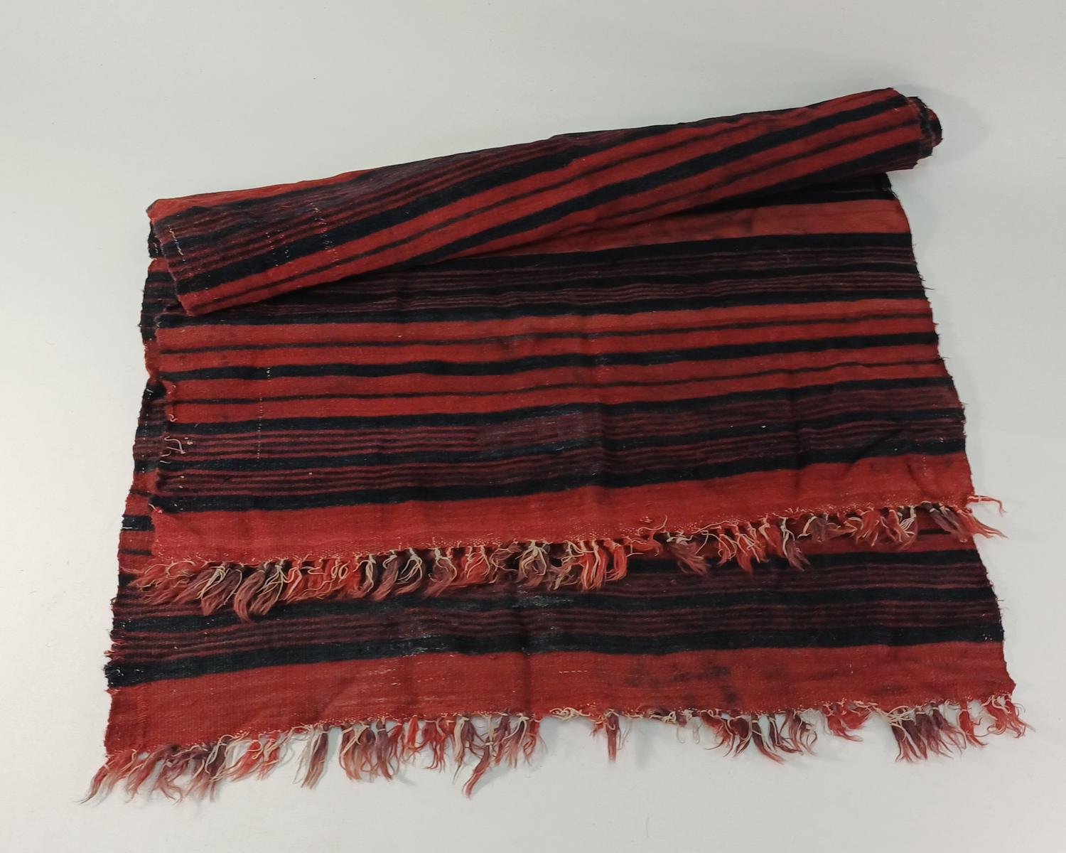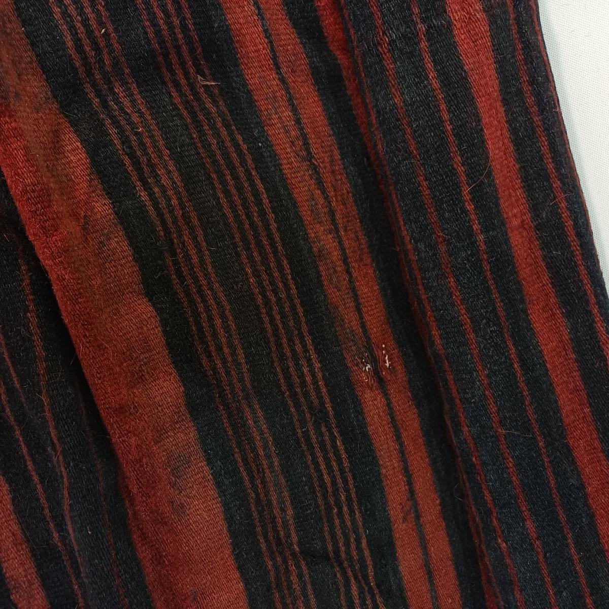 Χαλί διάδρομος σε μαύρες και κόκκινες αποχρώσεις, με κρόσσια στις μικρές διαστάσεις. Είναι μεταχειρισμένος, με κάποιες φθορές στο χρώμα λόγω χρήσης και παλαιότητας. Οι διαστάσεις του είναι 0,70 * 1,86 m.
