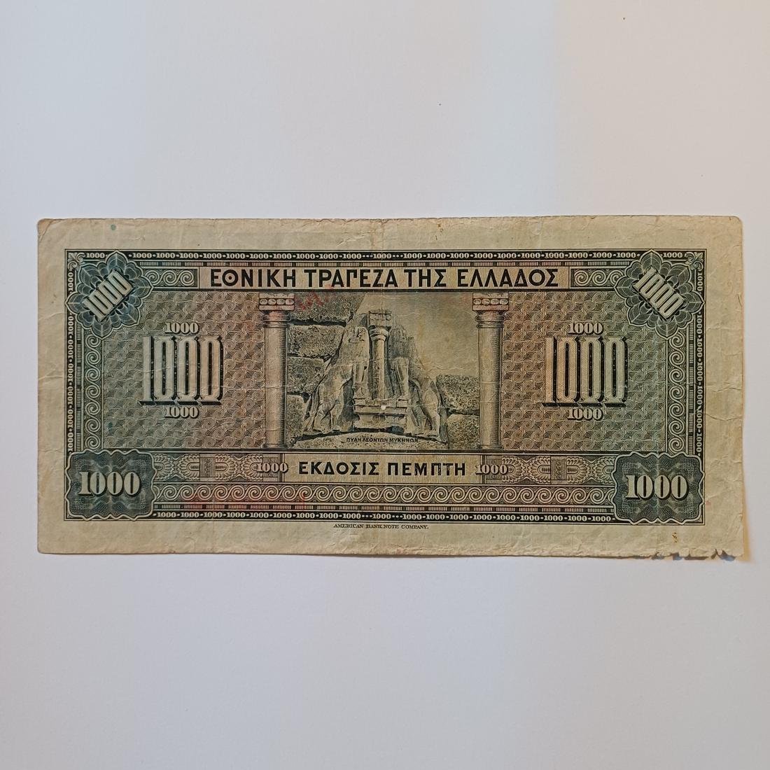 Χαρτονόμισμα των 1.000 δραχμών με ημερομηνία 4 Νοεμβρίου 1926 αποτελεί την «Πέμπτη Έκδοση» της Εθνικής Τράπεζας της Ελλάδος και εκτυπώθηκε από την American Bank Note Company στις ΗΠΑ. Στην κύρια όψη του δεσπόζει το πορτρέτο του Γεωργίου Σταύρου, ιδρυτή της Εθνικής Τράπεζας, πλαισιωμένο από διακοσμητικά στοιχεία και κολόνες δωρικού ρυθμού, ενώ στην πίσω όψη απεικονίζεται η ανάγλυφη παράσταση από την Πύλη των Λεόντων στις Μυκήνες. Το συγκεκριμένο κομμάτι φέρει την κόκκινη τοξωτή επισήμανση «ΤΡΑΠΕΖΑ ΤΗΣ ΕΛΛΑΔΟΣ» και ένα κόκκινο ορθογώνιο πλαίσιο πάνω από την ένδειξη «Ο ΕΠΙΤΡΟΠΟΣ», στοιχεία που υποδηλώνουν τη χρήση του κατά τη μεταβατική περίοδο ίδρυσης της Τράπεζας της Ελλάδος (περί το 1928) ως προσωρινή έκδοση.