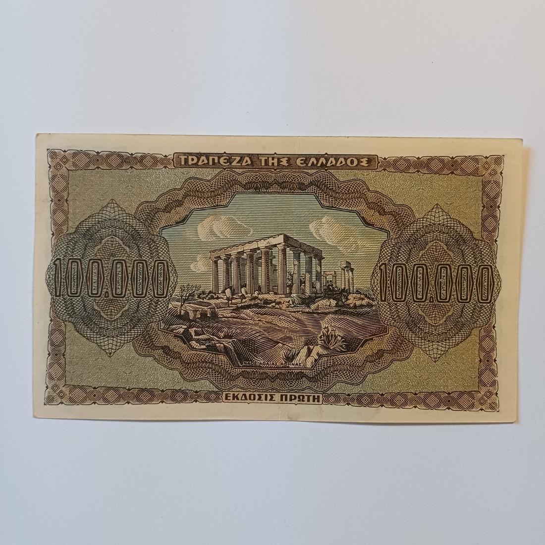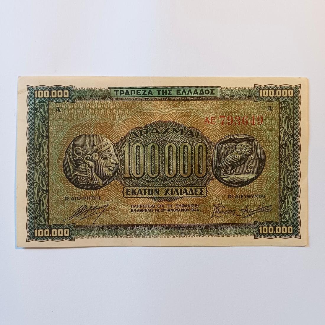 Χαρτονόμισμα των 100.000 δραχμών από την Τράπεζα της Ελλάδος στις 21 Ιανουαρίου 1944. Αποτελεί χαρακτηριστικό δείγμα της πληθωριστικής περιόδου κατά το τέλος της γερμανικής κατοχής στην Ελλάδα (B’ Παγκόσμιος Πόλεμος). Στην εμπρόσθια όψη του κυριαρχούν η αρχαϊκή κεφαλή της Αθηνάς και η γλαύκα (κουκουβάγια).
