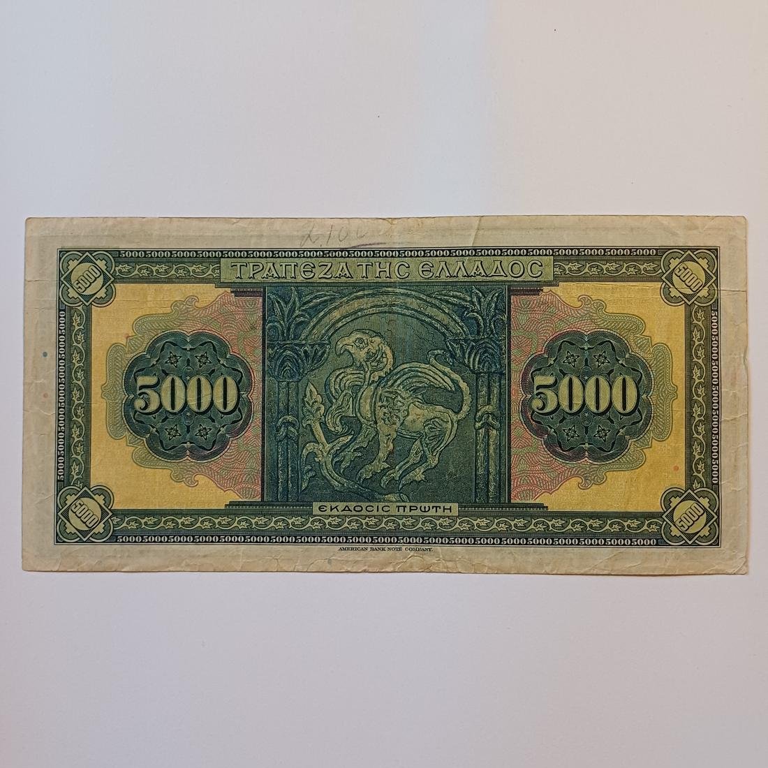Χαρτονόμισμα των 5.000 δραχμών από την Τράπεζα της Ελλάδος, με ημερομηνία έκδοσης την 1η Σεπτεμβρίου 1932. Αποτελεί σημαντικό κομμάτι της ελληνικής νομισματικής ιστορίας, καθώς φέρει την υπογραφή της Τράπεζας της Ελλάδος και τυπώθηκε από την American Bank Note Company. Στην κύρια όψη του δεσπόζει η κεφαλή της θεάς Αθηνάς με περικεφαλαία στο κέντρο, πλαισιωμένη από δύο μεγάλα διακοσμητικά πλαίσια που αναγράφουν την ονομαστική αξία.