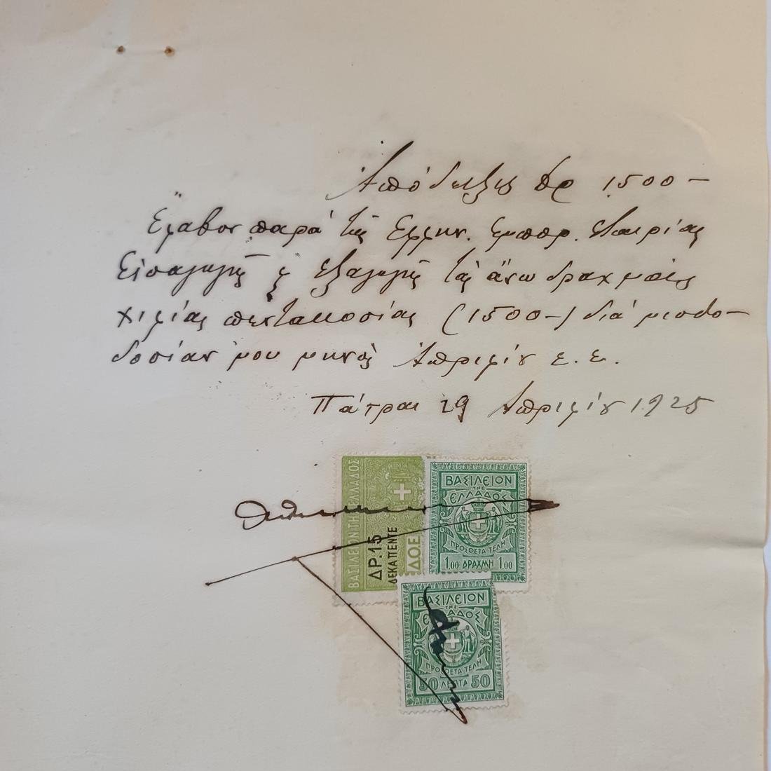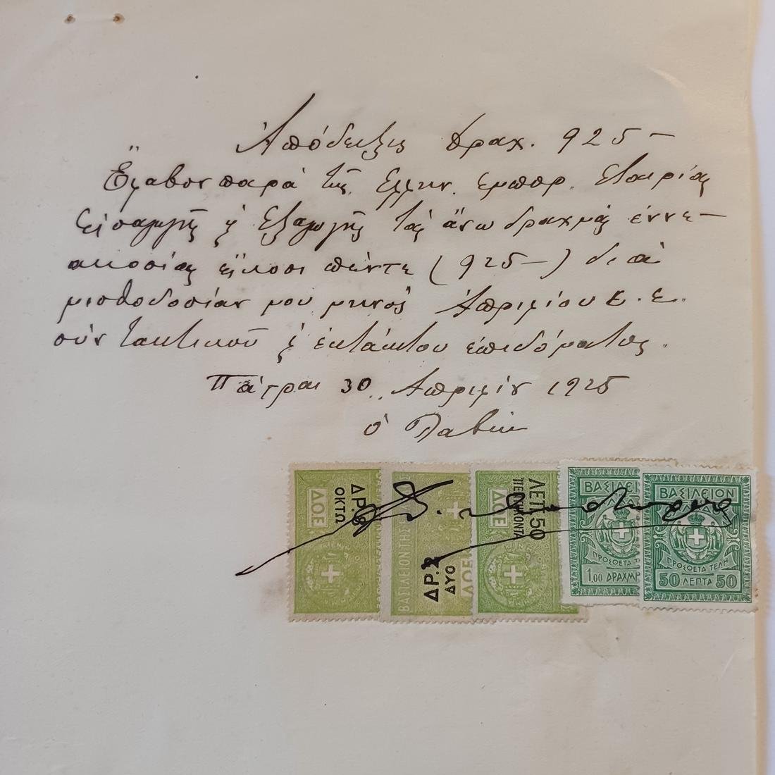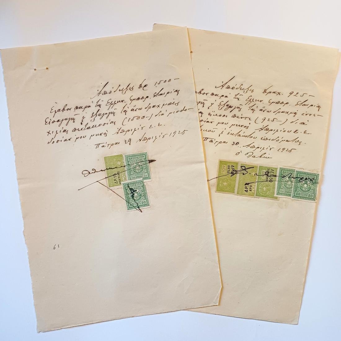 Χειρόγραφες αποδείξεις πληρωμής που εκδόθηκαν στην Πάτρα στα τέλη Απριλίου του 1925