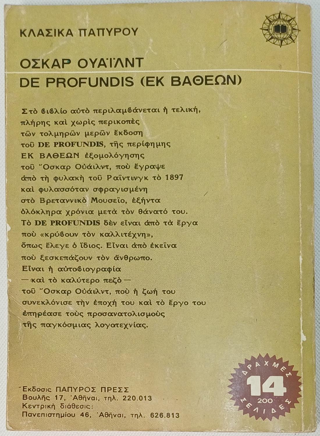 Το βιβλίο “De Profundis” του Όσκαρ Ουάιλντ, μέρος της σειράς «Κλασικά Παπύρου». Το έργο αποτελεί μία εκτενή, αυτοεξομολογητική επιστολή που συνέγραψε ο Ουάιλντ το 1897 κατά τη διάρκεια της φυλάκισής του, απευθυνόμενος στον πρώην εραστή του, Λόρδο Άλφρεντ Ντάγκλας. Σε αυτήν, ο συγγραφέας αναλύει τους παράγοντες που οδήγησαν στην πτώση του, τη σχέση τους, και διαλογίζεται πάνω στα δεινά, την τέχνη και τη ζωή, καθιστώντας το ένα από τα σημαντικότερα αυτοβιογραφικά κείμενα της παγκόσμιας λογοτεχνίας.