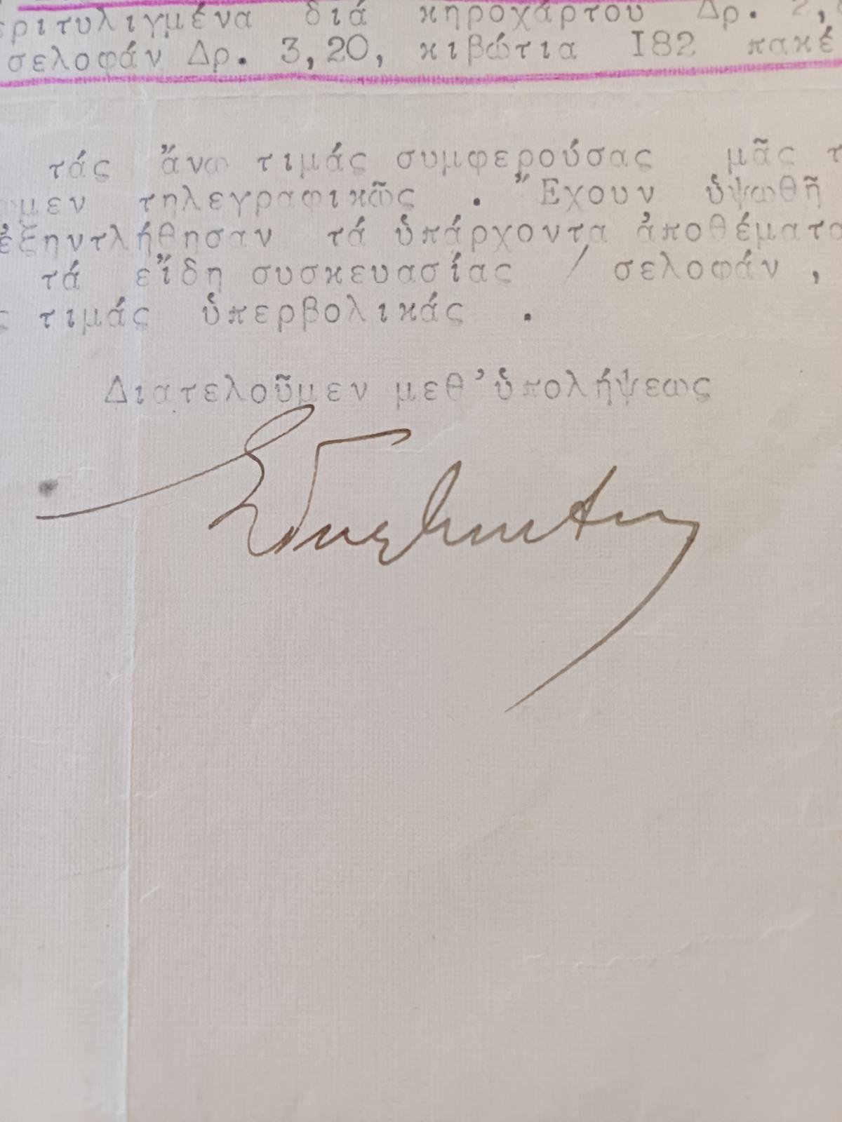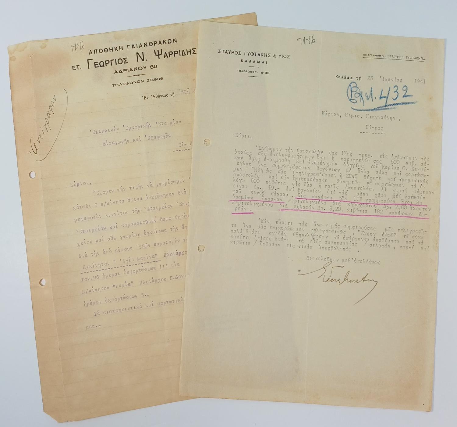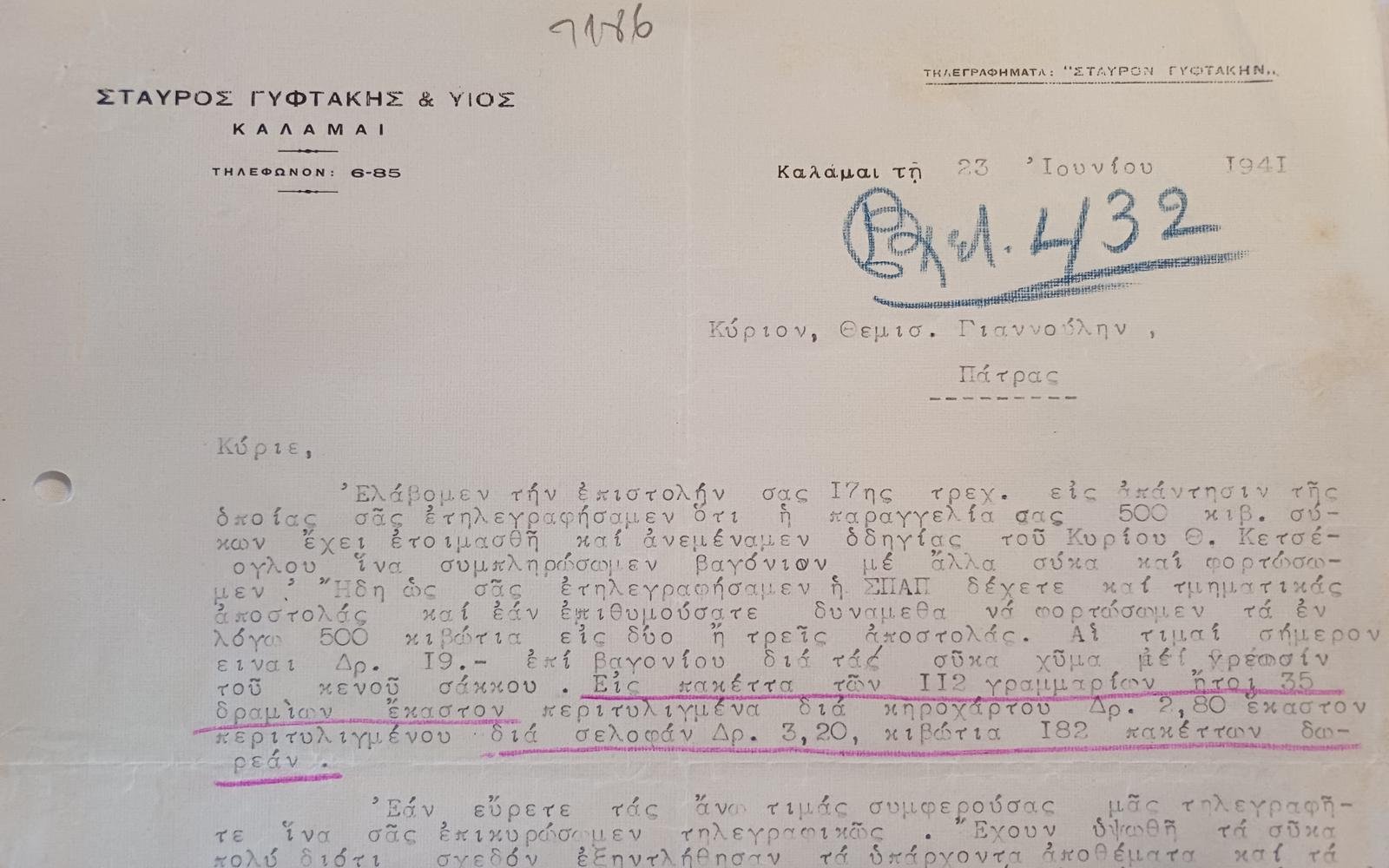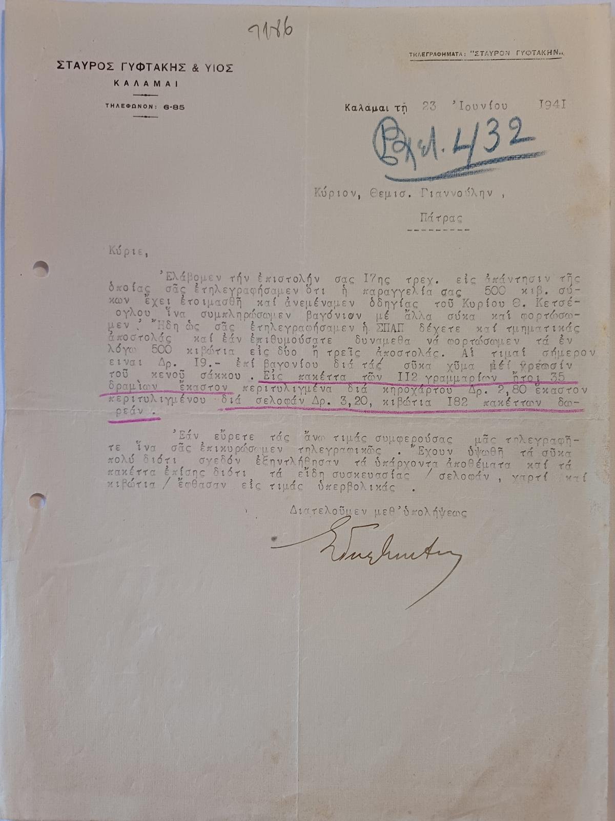 Επιστολή από την εταιρεία “Σταύρος Γυφτάκης & Υιός” Καλαμάτας, αφορά την πώληση και αποστολή 500 κιβωτίων σύκων από την Καλαμάτα στην Πάτρα. Η επιστολή χρονολογείται στις 23 Ιουνίου 1941 και φέρει χειρόγραφη υπογραφή του ιδιοκτήτη της εταιρείας.