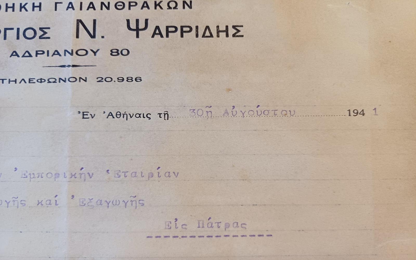Επιστολή από την “Αποθήκη Γαιανθράκων Γεώργιος. Ν. Ψαρρίδης” προς την ‘Ἑλληνικήν Εμπορικήν ἑταιρίαν εἰσαγωγής καί ἐξαγωγής” στην Πάτρα, με ημερομηνία 30 Αυγούστου 1941, η οποία ανακοινώνει τη ναύλωση των πλοίων «Αγία Μαρίνα» και «Σαρία» για τη μεταφορά λιγνίτη από τη Δύμη στην Πάτρα.