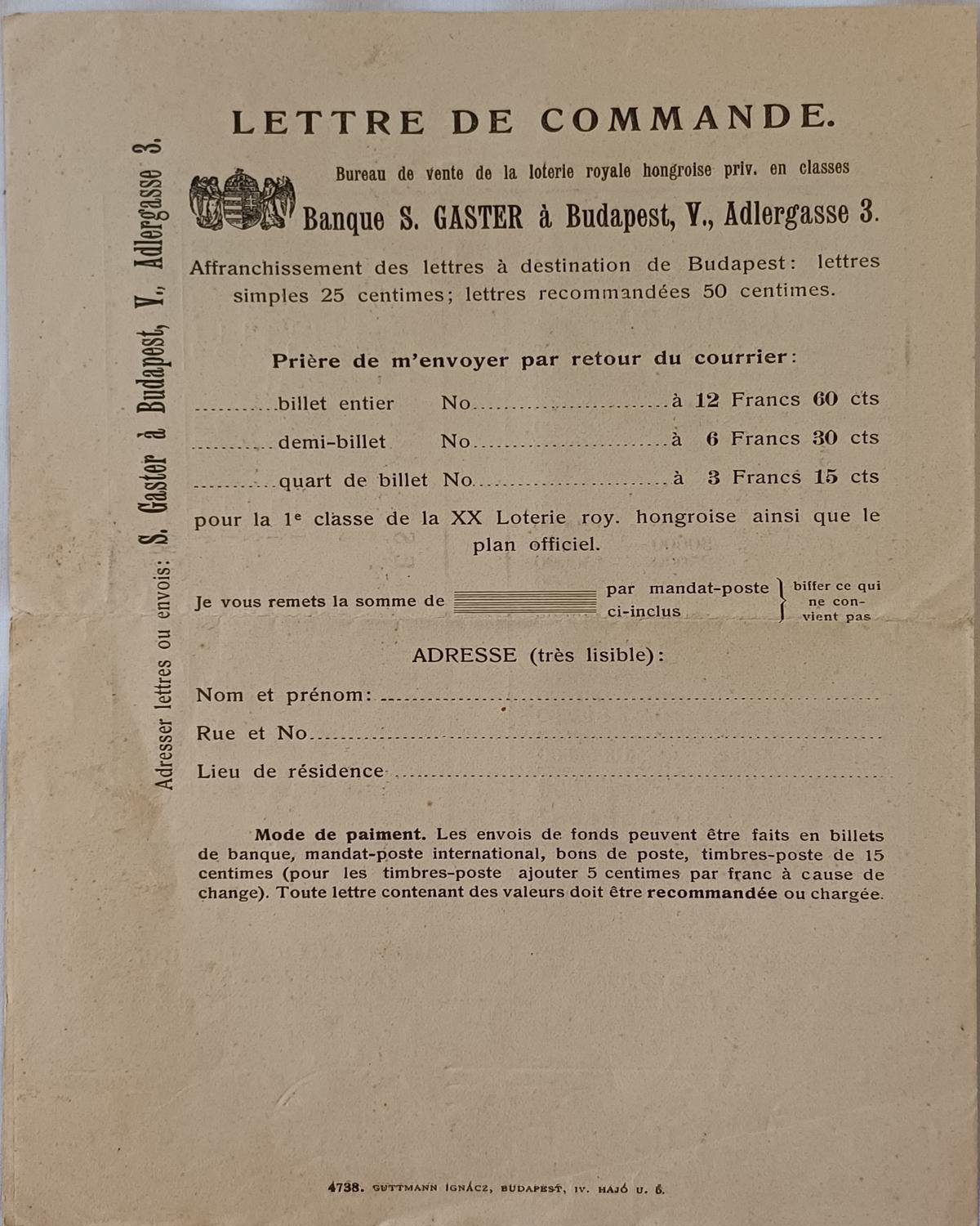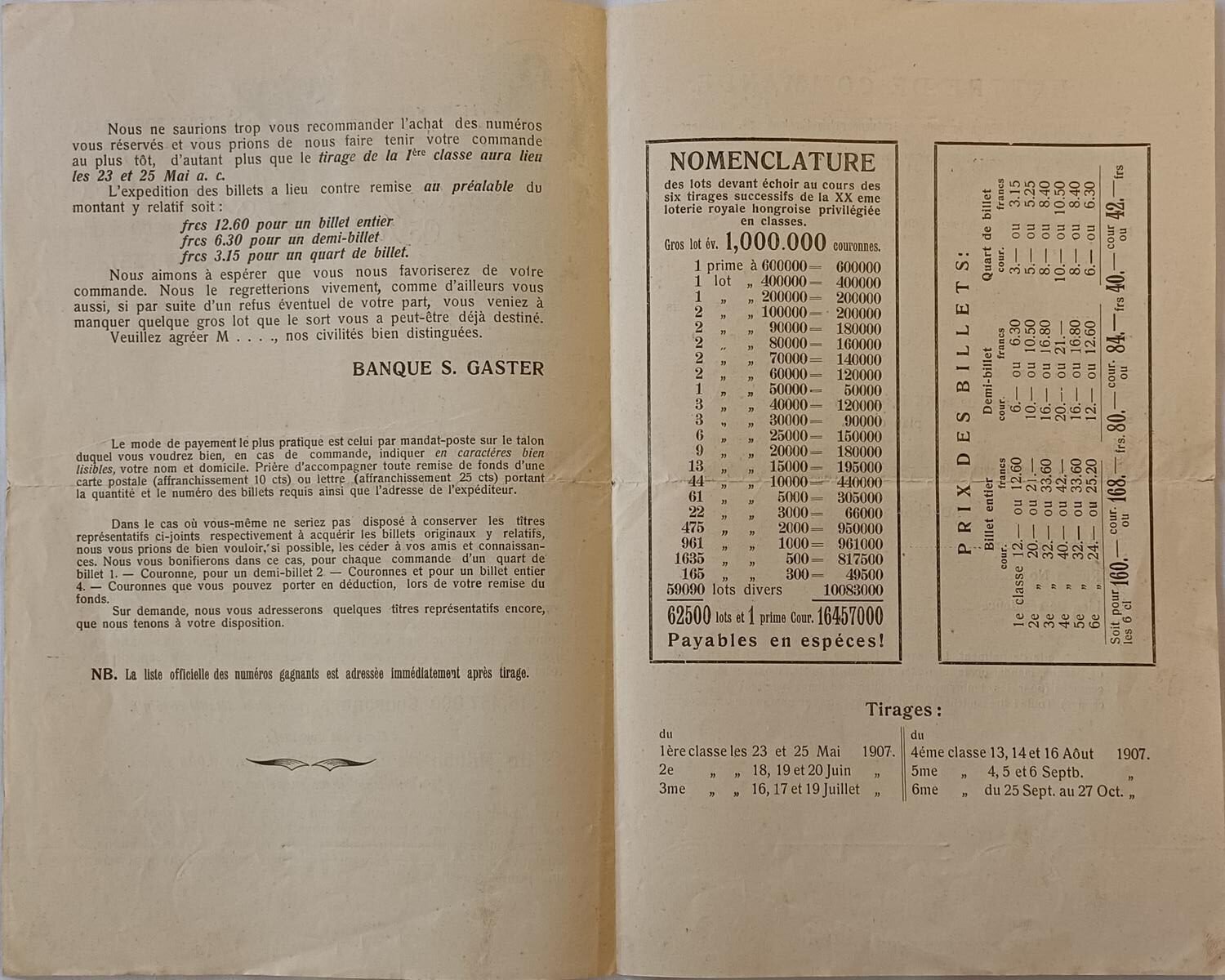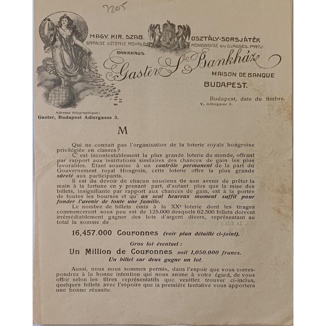 Λιθόγραφο έντυπο-διαφημιστικό φυλλάδιο  από την τράπεζα (Bankhaus) Gaster & Co. (V. Adlergasse 3, Βουδαπέστη) το οποίο προωθεί την 20ή κλήρωση της προνομιακής Ουγγρικής Βασιλικής Λοταρίας Κλάσεων (“Royal Hungarian privileged class lottery”). Οι διαστάσεις του διαφημιστικού φυλλάδιου είναι 23,5 x 15 cm και έχει 4 σελίδες.
