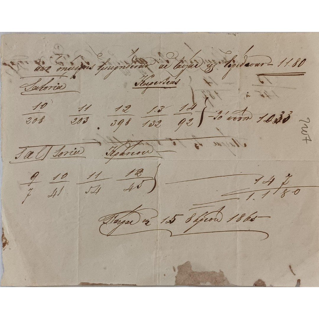 Χειρόγραφο έγγραφο “Καταμέτρηση προιόντων” 1865 Πάτρα.