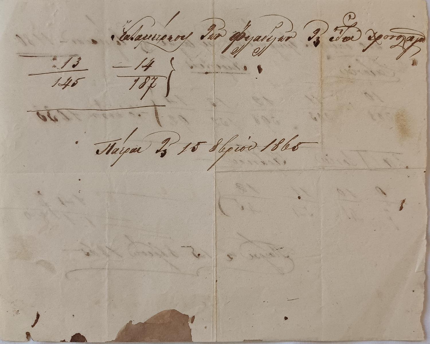 Ετικέτες: 19ος, Έγγραφα, Πάτρα, Σπάνια, Συλλεκτικά, Τεκμήρια, Χειρόγραφα