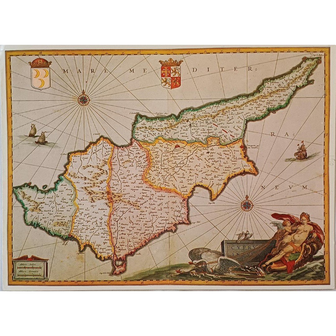 Ευχετήρια κάρτα του Υπουργού Γεωργίου Μαύρου Προέδρου της ενώσεως Κέντρου. Απεικονίζεται ο χάρτης της Κύπρου «Χάρτη της Κύπρου» (“Map of Cyprus”) από τους Ολλανδούς καλλιτέχνες Blau και Jansonius, το οποίο χρονολογείται αρχικά από το 1640. Πρόκειται για αναπαραγωγή της πρωτότυπης λιθογραφίας, η οποία κυκλοφορούσε από της εκδόσεις “Daisy” με τον αριθμό 700-10. Διαστάσεις της ευχετήριας κάρτας είναι 22,5 x 17 cm μαζί με προσωπικές ευχές.