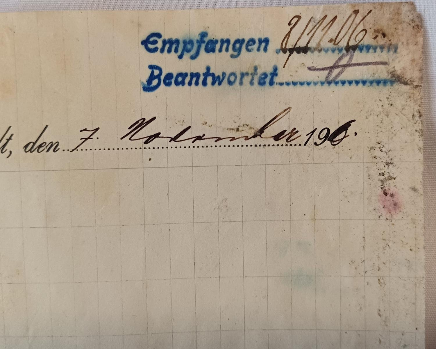 Εξαιρετικά σπάνια χειρόγραφη επιστολή από τη γερμανική “ασφαλιστική εταιρεία” Badische Feuerversicherungs-Bank, είχε έδρα την Καρλσρούη και είχε γενική αντιπροσωπεία στη Neustadt a. d. Haardt, με ημερομηνία 7 Νοεμβρίου 1906. Αποστέλλεται στην Πατρινή εταιρεία Hamburger.