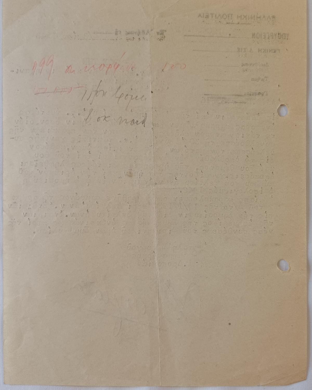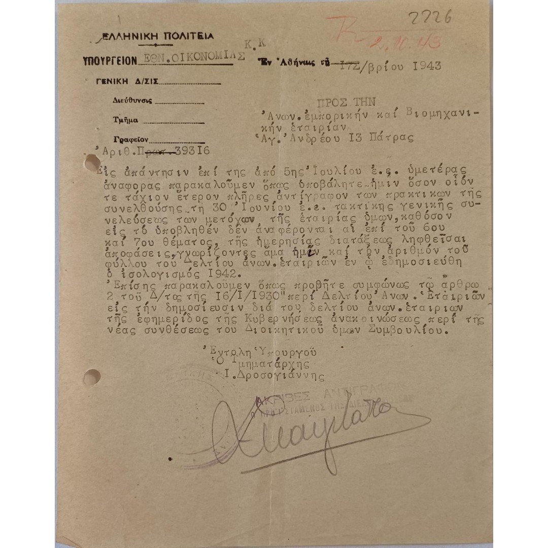 Κατοχική επιστολή του Υπουργείου Εθνικής Οικονομίας της Ελληνικής Πολιτείας, με ημερομηνία 17 Φεβρουαρίου 1943 στην Αθήνα, απευθύνεται στην «Ανων. ἐμπορικήν καί Βιομηχανικήν ἑταιρίαν» στην Πάτρα, με εντολή του Υπουργού Τμηματάρχης Ι. Δροσογιάννη. Διαστάσεις είναι 20 x 15 cm. Με υπογραφή και σφραγίδες.