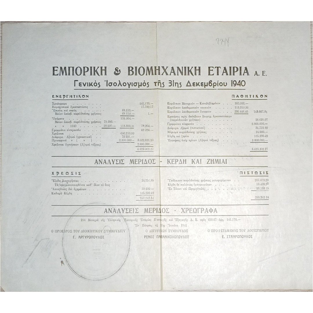 WWII – Δεύτερος παγκόσμιος πόλεμος, γενικός ισολογισμός της εταιρείας “ΕΜΠΟΡΙΚΗ & ΒΙΟΜΗΧΑΝΙΚΗ ΕΤΑΙΡΙΑ Α. Ε.” για το έτος 1940. 31 Δεκεμβρίου 1940. Οι διαστάσεις του εντύπου είναι 39 x 29 cm.